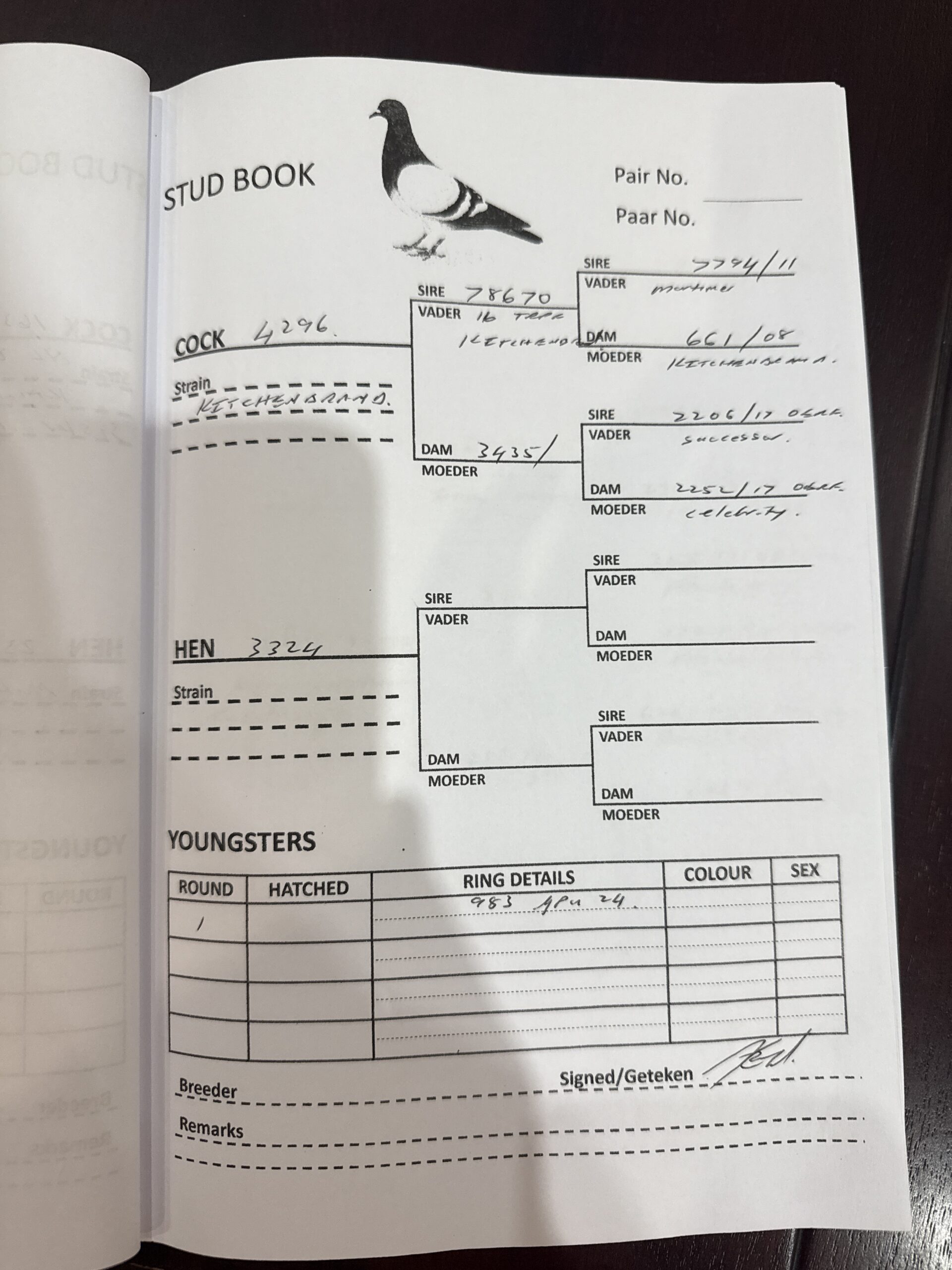 LOT 32 AFRIKAPRO AUCTION 2 -Pigeon Palace 1-ZA-24-JWDK-4120 -SIRE: BELG 20 6243189 “KATALIS NEW KIM”. KAASBOER. BROTHER X NIECE NEW KIM BOUGHT FROM PIPA. INBRED BROTHER AND NIECE TO 1ST NAT ACE BIRD “NEW KIM”. FATHER IS FULL BROTHER TO NEW KIM.———DAM:OERF-20-8163 H”GEMMA”. Super handler and silky soft feathers. Joseph’s mix purchases R132 000, father to 20th place winner at Afrika Pro 2024 final race and Anel on PIPA auction for R95 000. Anel is grandmother to Race 6 and Race 7 13th place winner at Afrika Pro 2024. Anel is grand mother to 2nd Ace.SEE PEDIGREE!!!