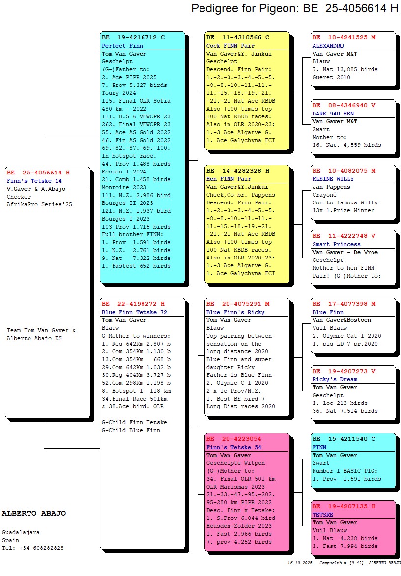 LOT 31 AFRIKAPRO AUCTION 4 – Tom van Gaver – Alberto Abajo ES-BE-25-4056614 -SIRE:BE 19-4216712 C.Perfect Finn Tom Van Gaver Geschelpt (G-) Father to: 2. Ace PIPR 2025 7. Prov 5.327 birds Toury 2024.115. Final OLR Sofia 480 km – 2022 111. H.S 6 VFWCPR 23. 262. Final VFWCPR 23 55. Ace AS Gold 2022 46. Fin AS Gold 2022 69.-82.-87.-69.-100. In hotspot race. 44. Prov 1.488 birds Ecouen I 2024 21. Comb 1.458 birds Montoire 2023 111. N.Z. 2.986 bird Bourges II 2023 121. N.Z. 1.937 bird Bourges I 2023 103 Prov 1.715 birds. Full brother FINN: 1. Prov 1.591 birds 1. N.Z. 2.761 birds 9. Nat 7.322 birds 1. Fastest 652 birds.—————DAM:BE 22-4198272 H Blue Finn Tetske 72 Tom Van Gaver Blauw G-Mother to winners: 1. Reg 642Km 2.807 b 2. Com 354Km 1.130 b 13.Com 354Km 668 b 29.Com 642Km 1.032 b 30.Reg 404Km 3.727 b 52.Com 298Km 1.198 b 8. Hotspot I 118 km 34. Final Race 501km 38.Ace bird. OLR..SEE PEDIGREE!!!
