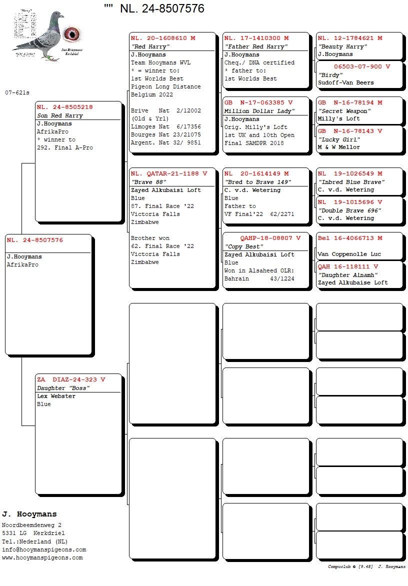 .LOT 5 AFRIKAPRO AUCTION 4 – Jan Hooymans II-NL-24-8507400 -SIRE:NL. 17-1411691 M Son New Witbuik J.Hooymans Co-bred H.v.Agtmael * Father to: 1st Prov Narbonne YL 6th Nat. Narbonne.————DAM:NL. 15-1793547 V Inbred Boemerang.C.J.de Heijde.Mother to 1. Pipa Ranking Best Belgian Yearl.. Int. Nat. Races ’20 3. Pipa Ranking Best European Yearl. Int. Nat. Races ’20 7. Nat. Narbonne ’20 (1st Prov. Antwerp.) 31. Nat Perigueux YL.SEE PEDIGREE!!!