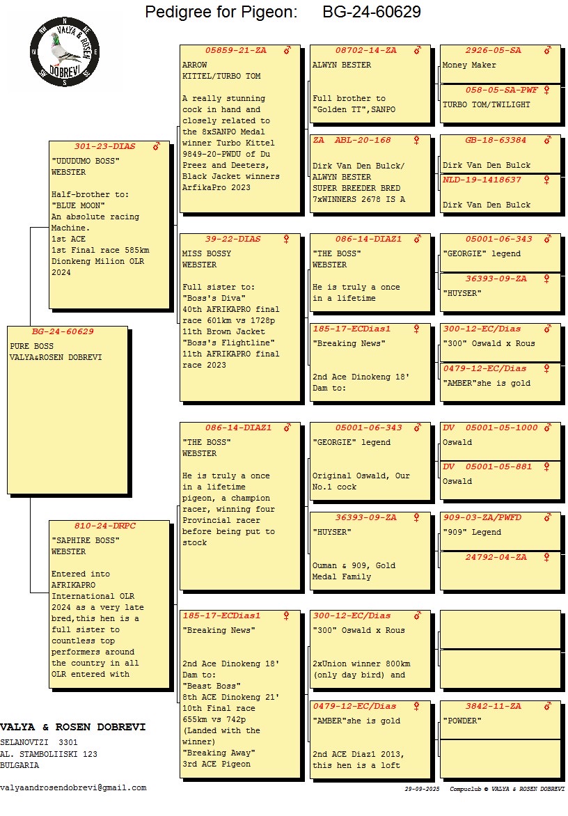 LOT 35 AFRIKAPRO AUCTION 1 – Valya & Rosen Dobrevi-BULGARIA-24-60629 -SIRE:301-23-DIAS.”UDUDUMO BOSS” WEBSTER. Half-brother to: “BLUE MOON” An absolute racing Machine. 1st ACE 1st Final race 585km Dionkeng Milion OLR 2024.———–DAM:810-24-DRPC. “SAPHIRE BOSS”. WEBSTER. Entered into AFRIKAPRO International OLR 2024 as a very late bred, this hen is a full sister to countless top performers around. the country in all OLR entered with.SEE PEDIGREE!!!