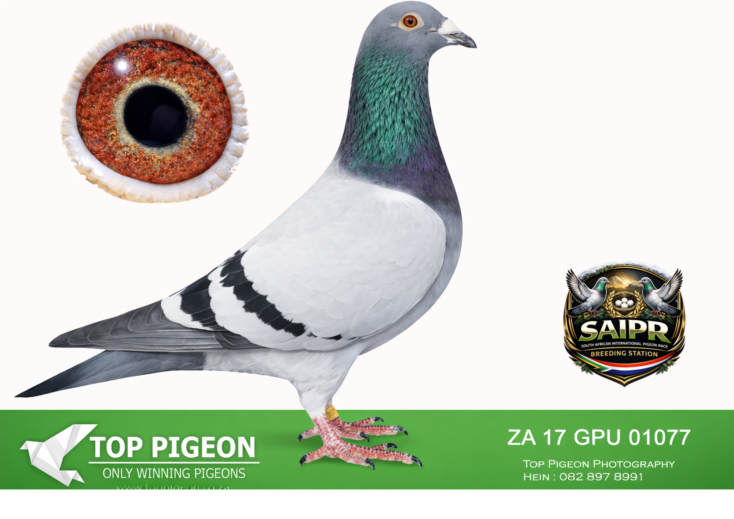 LOT 32 SAIPR BREEDING STATION – 974 ZA 20 GJT -17TH ACE BIRD CAPETOWN IOLR 2021———-SIRE: “CARELLI’S BEST” (Bak 17 Line) A top-class breeding cock built from the elite Bak 17 × Carelli Sablon foundation, known for producing consistent winners. He carries the blood of proven performers like “Mr Joy” (05891 GPU 13 ZA) – a top Verbesselt-based breeder responsible for multiple race winners, including performances in Million Euro & Taiwan races. On the dam side of the sire we find “Carelli Ace Line” (05777 GPU 13 ZA), a daughter of multiple winner breeders, reinforcing the Carelli Sablon strength. This cock is tightly bred to a powerful combination of De Rauw Sablon, Aelbrecht, and Bak 17, with influence from “Lucky Freddy” and “Marcelina”, both known for producing OLR super racers and high-performing progeny.————DAM: Direct KAASBOER Dynasty (Nr 1 Hen Line) An exceptional hen bred from the very best Kaasboer blood in South Africa, directly linked to the legendary “Gold Gouda P1600189” and “Kiran P1600177”. “Gold Gouda” – Nr 1 Kaasboer cock in SA, sire to a 7x winner, 3rd SAPIR, and multiple top performers. “Kiran” – Nr 1 Kaasboer hen in SA, dam of 7-time winners, SAPIR performers, and several proven breeders. This hen originates from the famous MC Hansen Kaasboer stud (Denmark), combining “Koe Oog” and “Bon Duivin”, two of the most influential Kaasboer pigeons ever imported. 👉 A powerhouse dam line known for consistency, durability, and top-level winning ability across generations.SEE PEDIGREE!!!
