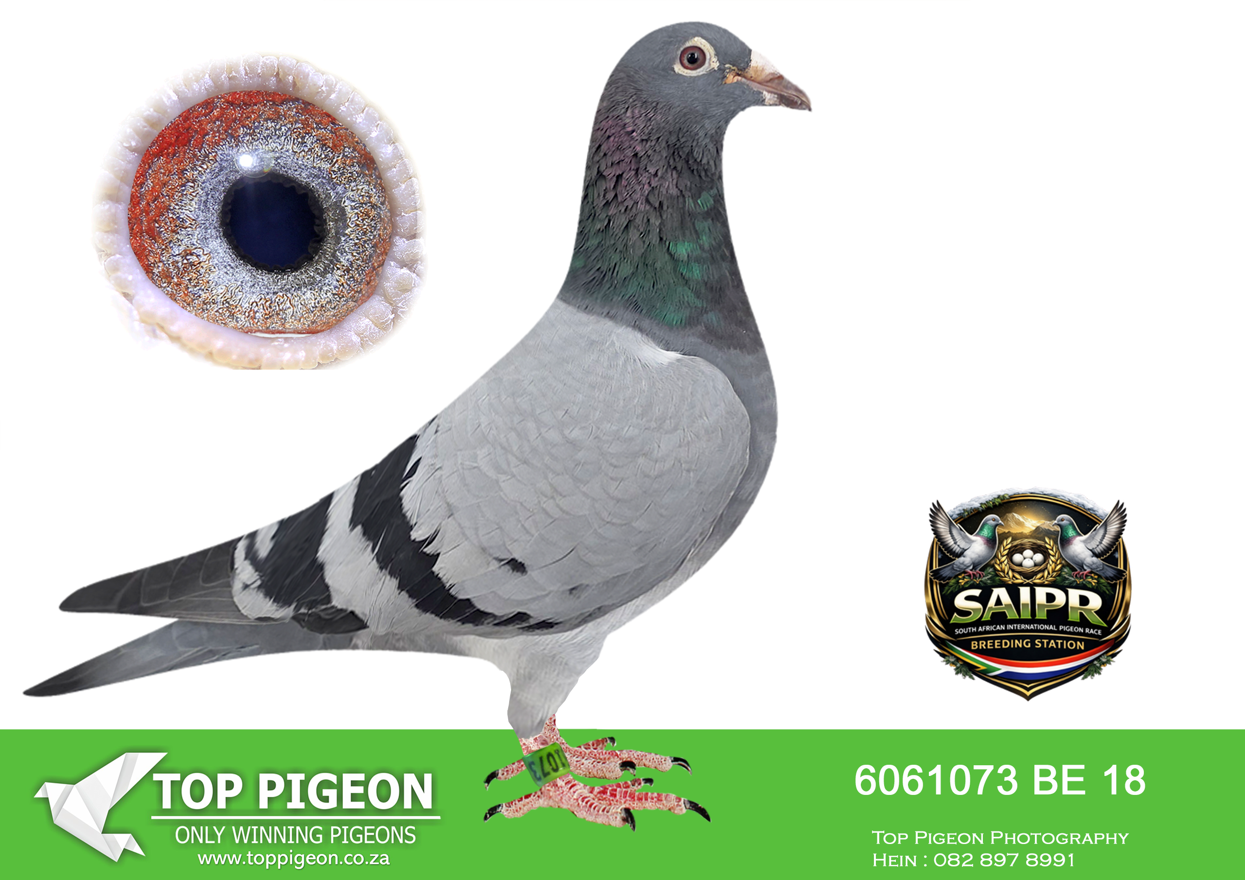LOT 18 SAIPR BREEDING STATION – 9286 ZA 19 GPU -SIRE: 0504 NRHU 12 ZA “Super 810 Seun” – Sablon Line Direct son of the legendary “810 Super Breeder” (BE 07-4253810) – one of the most influential De Rauw-Sablon foundation pigeons. This line is built on the famous Limoges blood, known worldwide for producing top long-distance and one-loft race performers.———DAM: 539 WRRPA 15 ZAD “Diep Hen” – Kaasboer x 810 A powerful Kaasboer × Sablon (810) hen combining two of the most dominant European winning families. Directly linked to: “Romano” (BELG 13-0946) – Kaasboer line, full brother to 0057 (2x 1st prizes) “Cottage Cheese” (ZA 13-3706) – granddaughter of “810”, from a click pair with multiple top-performing offspring Strong Kaasboer foundation via “Gaston” & “Grote Witpen”, both proven super breeders This dam line is known for: Exceptional breeding consistency Multiple winners produced for GJT Lofts Strong in-hand quality with perfect balance and vitality.SEE PEDIGREE!!!