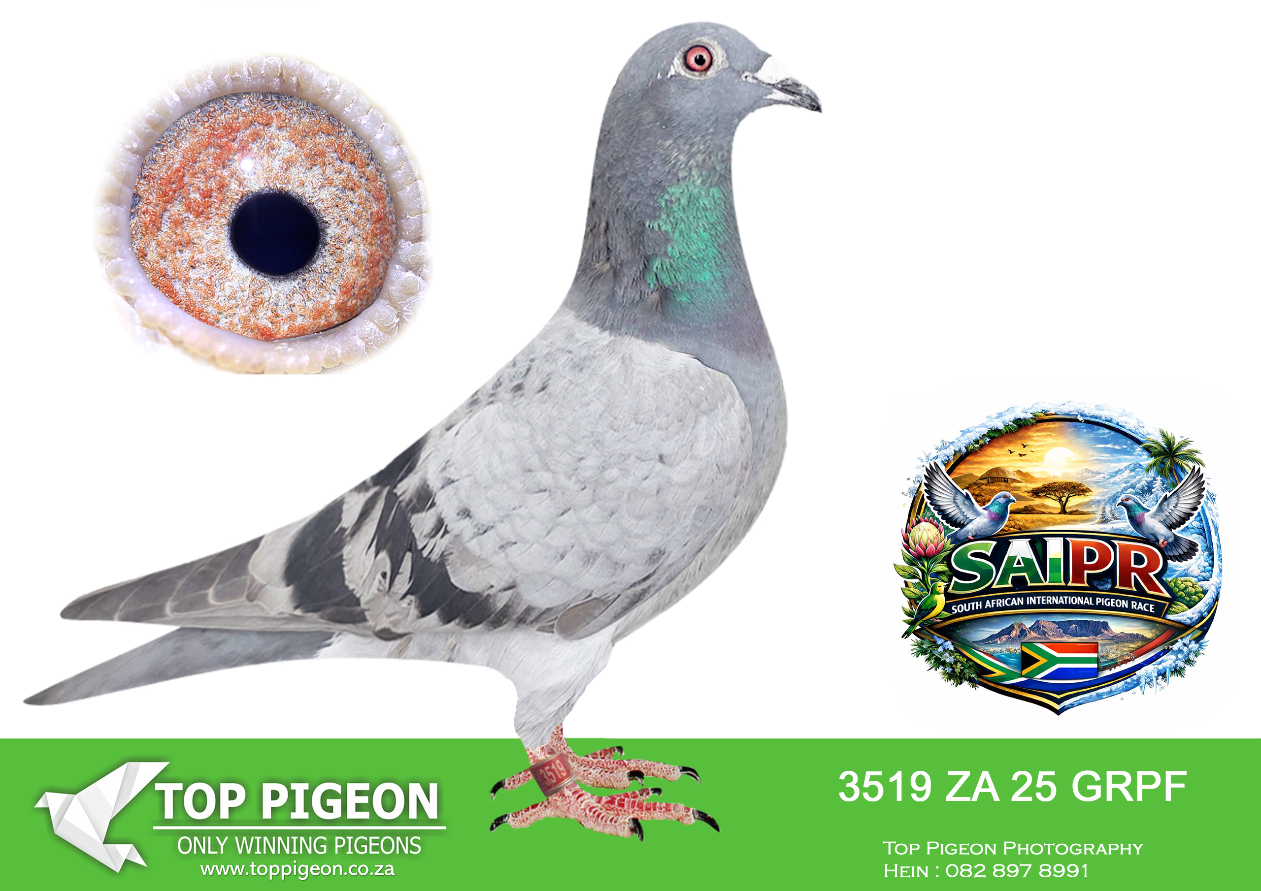 LOT 24 SAIPR SUMMER AUCTION 1 – Theuns Victor- VICTOR 107 2025 -9th Final Race WINNING R30 000.00——–SIRE:483 ZA 19 OOA .Alias “MR WOW” Strain: Tom Lock/Sablon Color: Blue Bar SUPER RACER 8 WEEKS IN A ROW FOR OOA LOFTS!! 7th Club, 18th VPU, Glen, Y/B, 286km, 1369mpm – 1993 pigeons 11th Club, 47th VPU, Tom’s Place, Y/B, 323km, 1416mpm – 2113 pigeons 49th Club, 152nd VPU, Springfontein, Y/B, 424km, 1014mpm————DAM:6493 ZA 21 KUR.Strain: Sablon/Tom Lock Color: Blue Bar.SEE PEDIGREE!!!!
