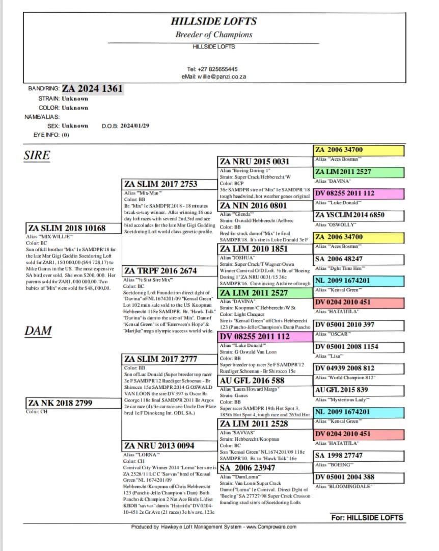LOT 37 SAIPR AUCTION B -WD Lofts-ZA 1361 2024 · CHALLENGE -SIRE:ZA 18 SLIM 10168 “MIX-WILLIE”. SON OF FULL BROTHER MIX 1ST SAMDPR FOR THE LATE GIGI GADDIN SOETDORING LOFTS SOLD FOR 1.1 MILLION RAND. TO MIKE GANUS IN THE US. THE MOST EXPENSIVE SA BIRD EVER SOLD. SHE WON $200 000.00. HER PARENTS SOLD FOR 1 MILLION RAND.——-DAM:ZA 18 NK 2799 . BRED OUT OF THE BEST SOETDORING BLOODLINES.SEE PEDIGREE!!!