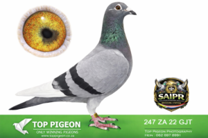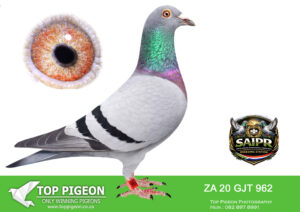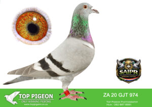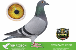 LOT 32 SAIPR BREEDING STATION – 974 ZA 20 GJT -17TH ACE BIRD CAPETOWN IOLR 2021———-SIRE: “CARELLI’S BEST” (Bak 17 Line) A top-class breeding cock built from the elite Bak 17 × Carelli Sablon foundation, known for producing consistent winners. He carries the blood of proven performers like “Mr Joy” (05891 GPU 13 ZA) – a top Verbesselt-based breeder responsible for multiple race winners, including performances in Million Euro & Taiwan races. On the dam side of the sire we find “Carelli Ace Line” (05777 GPU 13 ZA), a daughter of multiple winner breeders, reinforcing the Carelli Sablon strength. This cock is tightly bred to a powerful combination of De Rauw Sablon, Aelbrecht, and Bak 17, with influence from “Lucky Freddy” and “Marcelina”, both known for producing OLR super racers and high-performing progeny.————DAM: Direct KAASBOER Dynasty (Nr 1 Hen Line) An exceptional hen bred from the very best Kaasboer blood in South Africa, directly linked to the legendary “Gold Gouda P1600189” and “Kiran P1600177”. “Gold Gouda” – Nr 1 Kaasboer cock in SA, sire to a 7x winner, 3rd SAPIR, and multiple top performers. “Kiran” – Nr 1 Kaasboer hen in SA, dam of 7-time winners, SAPIR performers, and several proven breeders. This hen originates from the famous MC Hansen Kaasboer stud (Denmark), combining “Koe Oog” and “Bon Duivin”, two of the most influential Kaasboer pigeons ever imported. 👉 A powerhouse dam line known for consistency, durability, and top-level winning ability across generations.SEE PEDIGREE!!!