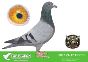 .LOT 1 SAIPR BREEDING STATION – 3687 ZA 17 TRPFD -A TRPF winner and full sister to the renowned “Koning Kaas”, she represents proven winning genetics at the highest level.————SIRE: The legendary “Gold Gouda P1600189” (0078 DAN 11 023) – regarded as the No.1 Kaasboer cock in South Africa. A phenomenal breeder, sire to 7 winners, including 3rd SAPIR 2014, and multiple other top performers. Bred from the famous “Koe Oog” x “Bont Duiven”, two elite Kaasboer pigeons from M.C. Hansen’s Danish stud. DNA profiled.————–DAM: The exceptional “Kiran P1600177” (6357873 BELG 10) – considered the No.1 Kaasboer hen in South Africa. A super breeder and producer of winners, including a 7-time winner across three seasons and 3rd SAPIR 2014. Known for breeding top pigeons with multiple cocks. Imported via PIPA and DNA profiled.SEE PEDIGREE!!!!