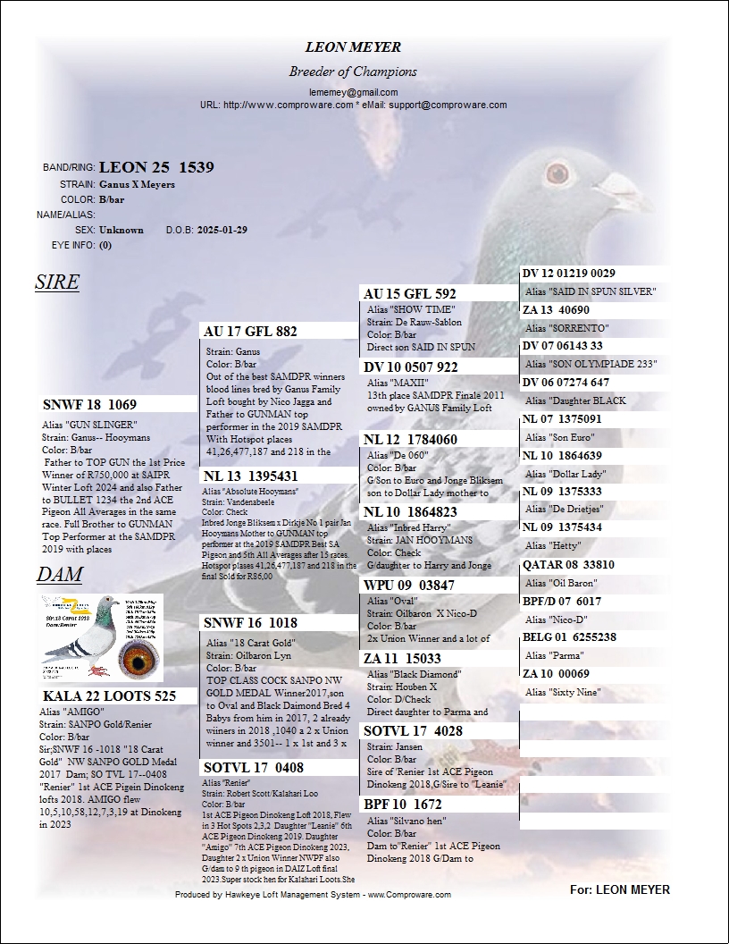 LOT 37 SAIPR SUMMER AUCTION 3 – Klerksdorp Racers 1-LEON 1539 2025 ——-WING INJURY——SIRE: ZA 18 SNWF 1069 . “GUN SLINGER”. GANUS/HOOYMANS. FULL BROTHER TO GUNMAN SUPER PERFORMER SCMDPR 2019 AND SOLD FOR R86 000.00—————DAM:ZA 22 KALAHARI LOOTS 525 “AMIGO” . 12TH RACE 4 (EQUAL WINNER) , 13RD RACE 7 (EQUAL WINNER) ,7th ace pigeon , WINNING R35000.00 IN PRIZE MONEY—Additional Information: ½ Br. ‘Leanie’ 6e Ace Dinokeng ,Dam is ‘Renier’ 1e Ace Dinokeng.SEE PEDIGREE!!!!