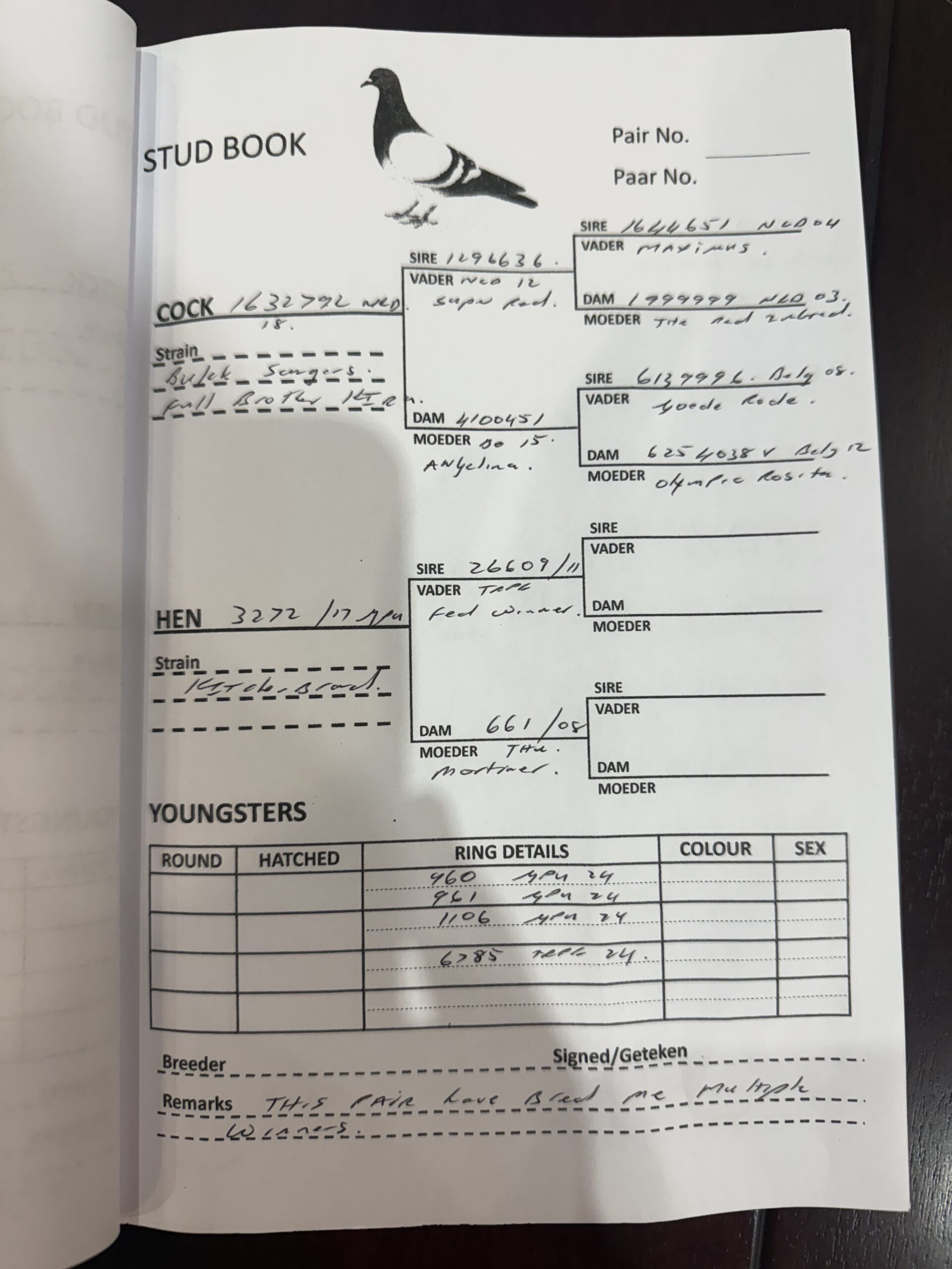 .LOT 9 AfrikaPro Auction 2B – Loft Einkamerer – ZA-24-LOFT EINKAMERER-184 -SIRE: 0783 SRSPV 17 D “CLAPTON”. LOFT EINKAMERER . THIS IS A DIRECT CHILD OF “PIZZARO” AND “ROSIE”.——–DAM:1539 SRPV 21 D. EINKAMERER.THIS IS A DIRECT GRANDCHILD TO “BALONNEKE”.SEE PEDIGREE!!!