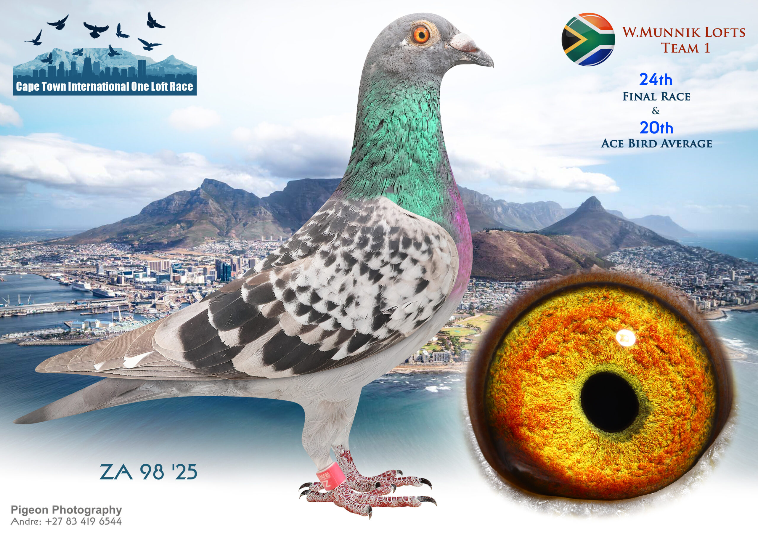 LOT 39 CAPETOWN LOFTS – W.Munnik Lofts Team 1-ZA-ZA-25-98*** -6TH HOTSPOT 3 EQUAL WINNER , 7TH HOTSPOT 4———SIRE:SIRE:SRPV 22 ZA 348 .Strain: VAN LOON/JANSEN Color: CHECK ALLFLIGHT CARNIVAL SUMMER RACE 2023 13/02/2023 5TH FINAL WIINNING R50 000 3RD ACE BIRD BRED OUT OF BEST SAMDPR GENES.————DAM:21 ZA 19775.Strain: TOM LOCK/SABLON Color: BLUEBAR BOUGHT FROM JJJ VD LINDE 30/08/2023. GOOD RACER,HER DAM FULL SISTER TO SANPO SILVER MEDAL ALL DISTANCE HEN 2021,ONLY DAY BIRD IN BLOEMFONTEIN FEDERATION. MOTHER TO WINNER ECOLR 2025 BY 1HOUR AND ACE PIGEON.SEE PEDIGREE!!!