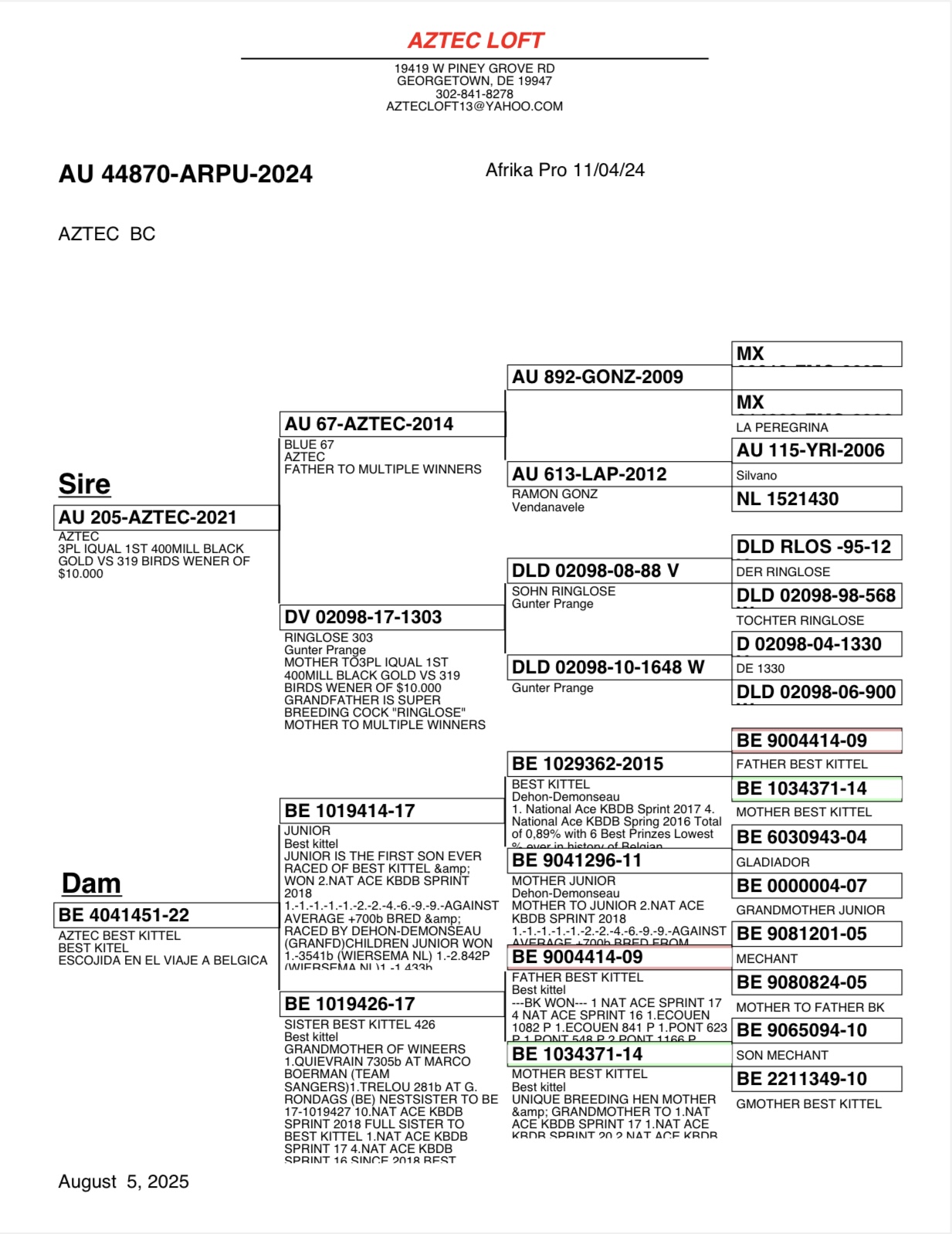 .LOT 4 AFRIKAPRO AUCTION 1 – Aztec Loft-AU-24-FOYS-44870 -SIRE:AU 205-AZTEC-2021.3PL IQUAL 1ST 400MILL BLACK GOLD VS 319 BIRDS WENER OF $10.000.———-DAM:BE 4041451-22 AZTEC BEST KITTEL BEST KITEL. SIRE IS JUNIOR IS THE FIRST SON EVER RACED OF BEST KITTEL & WON 2.NAT ACE KBDB SPRINT.SEE PEDIGREE!!!