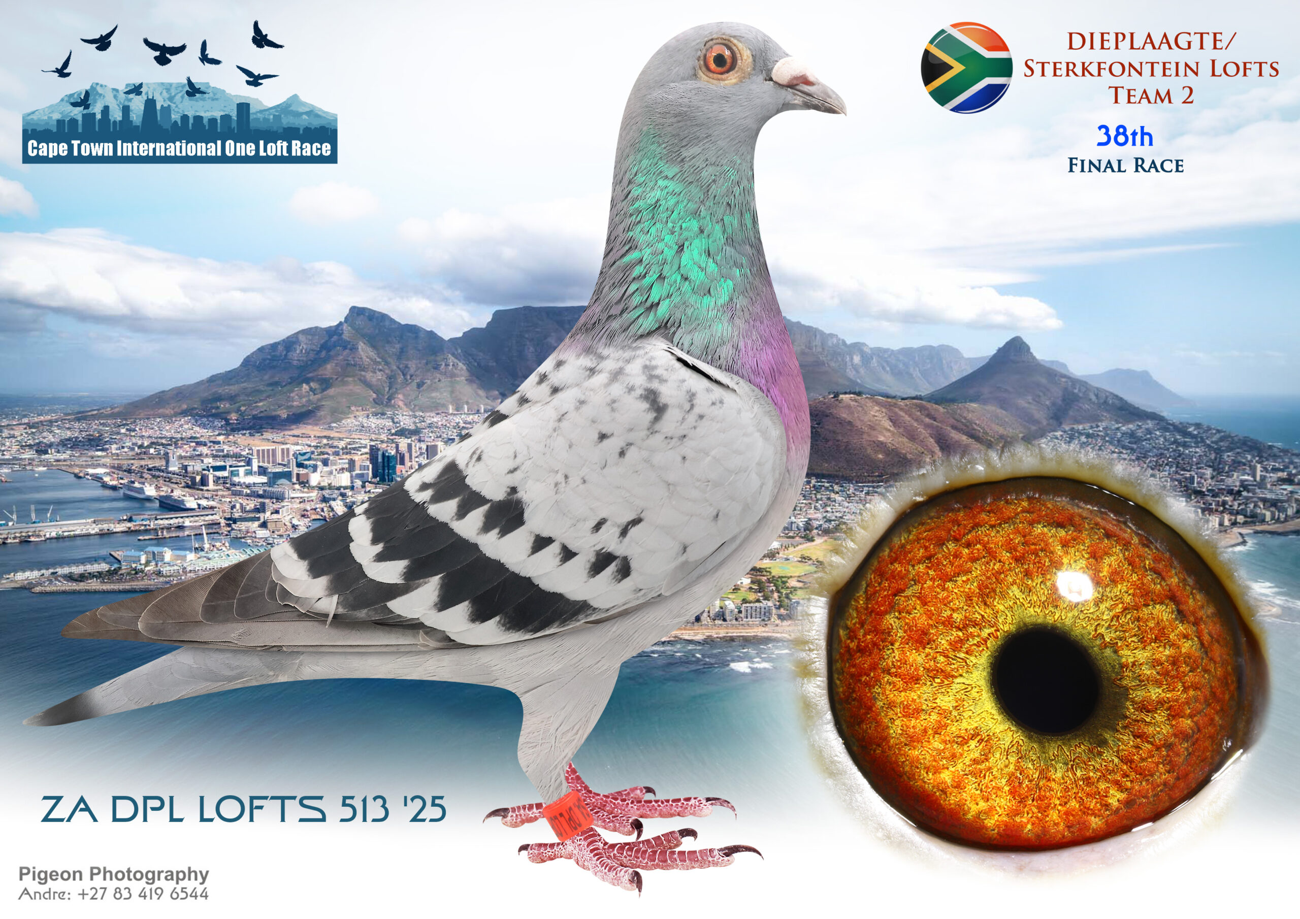 .LOT 4 CAPETOWN LOFTS AUCTION 2 – Dieplaagte/Sterkfontein Lofts Team 2 – ZA-DPL-25-513*** -SIRE:ZA-2023-DPL-43 Dieplaagte & Sterkfontein Lofts Grizzle • 9e Final Cape Town Int. 2023. His father is a super breeder! Sire’s half-sister “Black Beauty” • 3e Hotspot Victoria Falls. • 6e Hotspot Victoria Falls. Mother bred “DSS4” • 7e Final Cape Town Int. 2022. • 5e Ace Cape Town Int. 2022. Sister 0722 is mother of “La Favourite” • 16e Final Cape Town Int. 2022. The sister to “Fred” • 2e Final Africa Pro Series 2022. Team Vision Won R1.8 Million!!! ======================DAM:ZA-2021-DPL-31 “PICO-KLAAS” Dieplaagte & Sterkfontein Lofts Blue Full-sister to: • 11e Final Cape Town Int. 2022. • 31e Ace Cape Town Int. 2022.SEE PEDIGREE!!!!