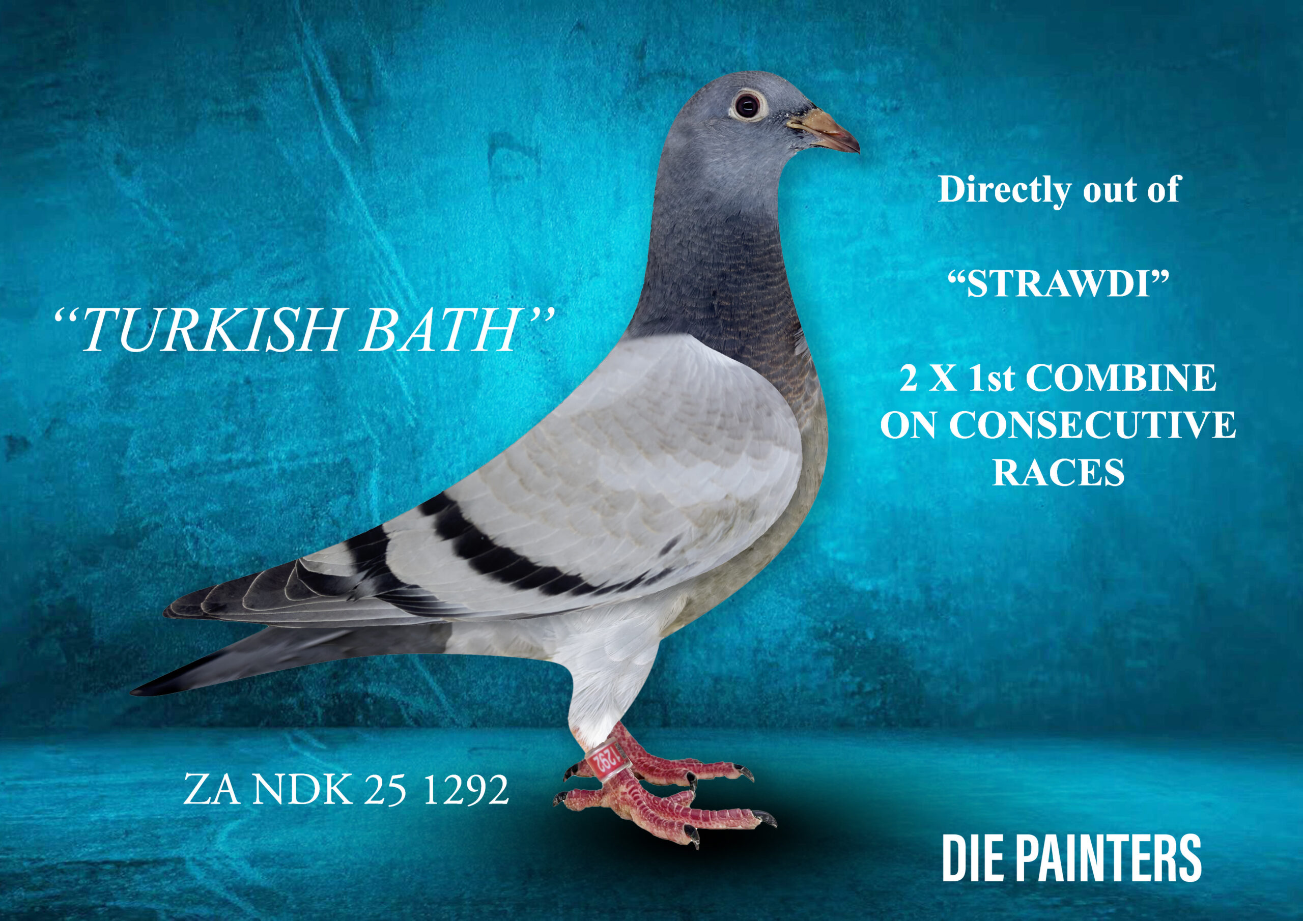 .LOT 4 DIE PAINTERS – ZA 25 NDK 1292 “TURKISH BATH” – Painter BB Directly out of The famous “STRAWDI” is a 3 X Combine Winner & Sales Race Winner. She won 2 X 1st Combine in the space 7 days from 589km & 654km vs more than 1200 pigeons on each occasion. Bred from a proven pair. Father is bred by Ahmet Cavdar from Turkey. He is widely respected as owning one of the best collections of modern performance pigeons. He is bred out of a son of the worldfamous “ORNAT” when mated to a daughter of the equally famous “OLYMPIC GAUSTAVE” – fresh super performance genetics!SEE PEDIGREE!!!