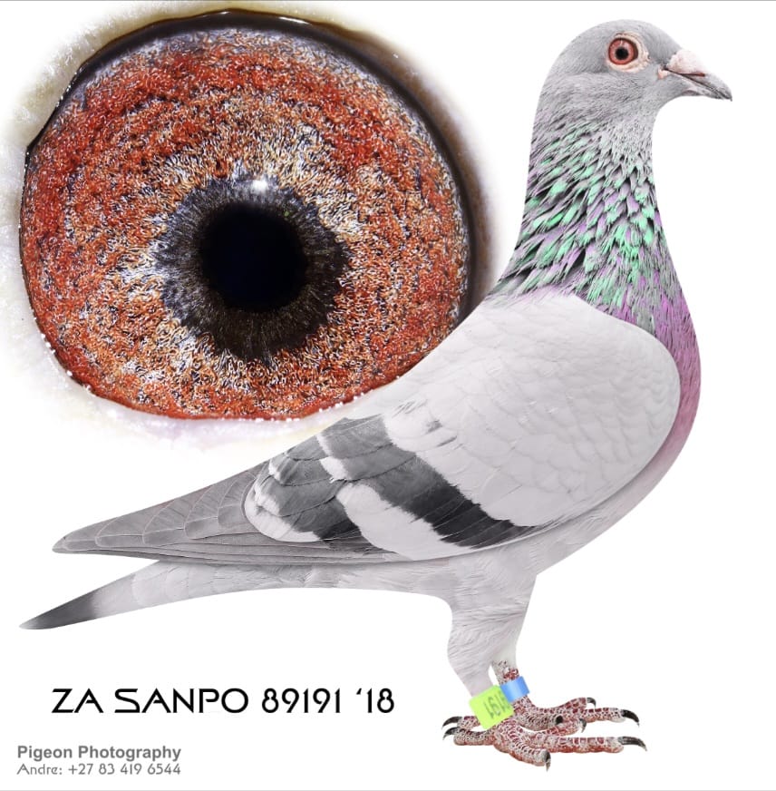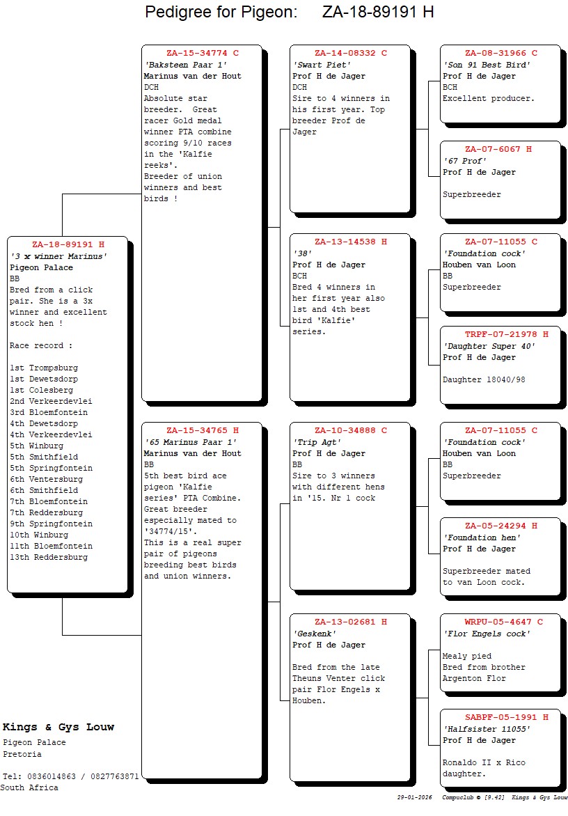 .LOT 4 EXCLUSIVE AUCTION -ZA 18 89191 -Bred from a click pair. She is a 3x winner and excellent stock hen——–SIRE:ZA 15 34774 “BAKSTEEN PAAR 1”. MARINUS VAN DER HOUT. ABSOLUTE STAR BREEDER. GREAT RACER. GOLD MEDAL WINNER PTA COMBINE SCORING 9/10 RACES IN THE “KALFIE REEKS”. BREEDER OF UNION WINNERS AND BEST BIRDS.———-DAM:ZA 15 34765 “65 MARINUS PAAR 1”. MARINUS VAN DER HOUT. 5TH BEST BIRD ACE PIGEON KALFIE REEKS PTA COMBINE. GREAT BREEDER ESPECIALLY MATED TO 34774/15. THIS IS A REAL SUPER PAIR OF PIGEONS BREEDING BEST BIRDS AND UNION WINNERS.SEE PEDIGREE!!!