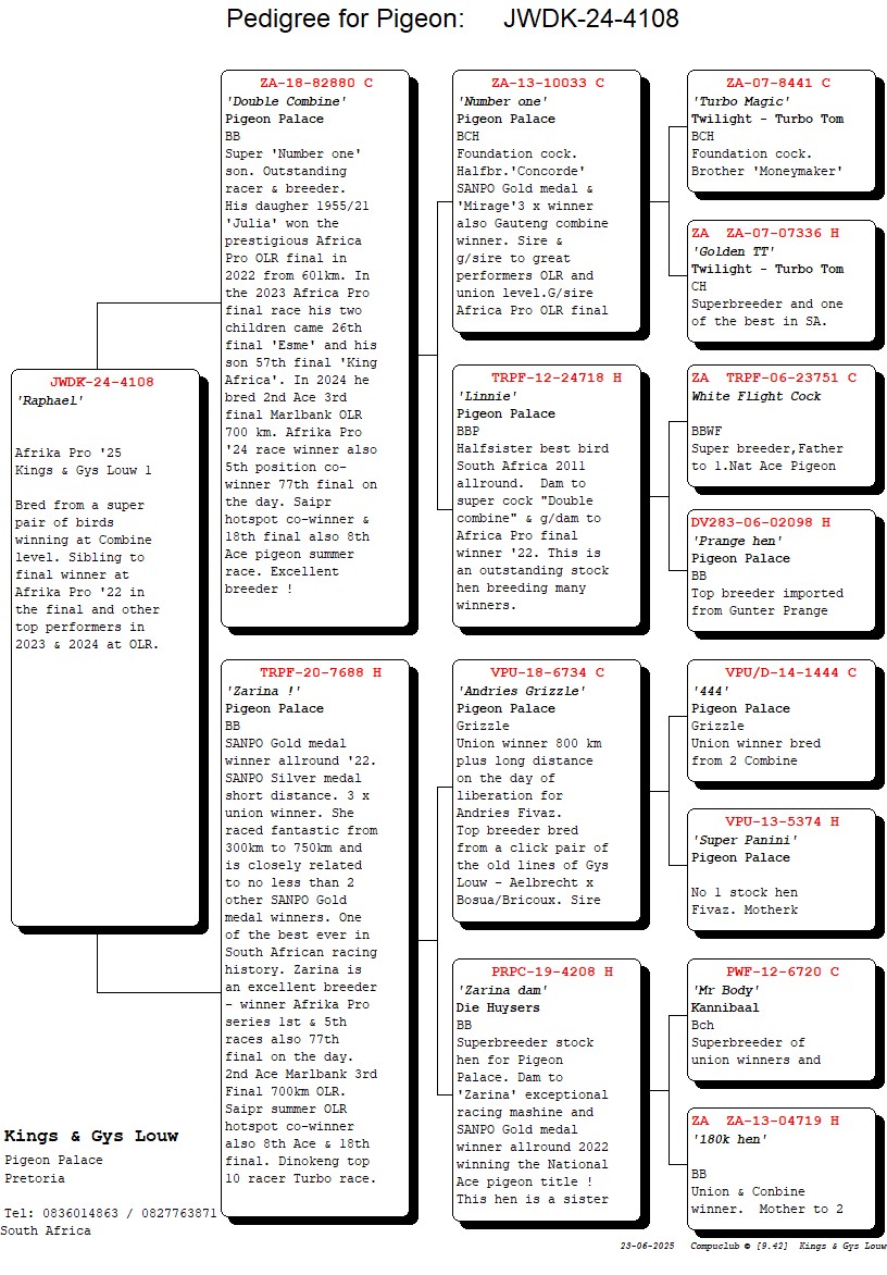 LOT 17 AfrikaPro Auction 2B – Marnes Nel – ZA-24-WPUD-1355 -EQUAL WINNER RACE 1———The father is a cross between – a Cock from Egbert OKelly, top breeder. 16th final Victoria falls 2024, 27th final Afrika Pro 2023, 7th final Saipr winter race 2025, 3rd Hotspot 5 Victoria falls 2025 out of 1559 pigeons. Paired with the nestmate sister of Love 3, now named Victory Love, 1st Super ace Victoria falls 2022. She also bred 20th final Victoria falls 2023. The mother, 3710, is a hen that I bred that raced for Hough Kotze. Pigeon was the young bird Champion, most points in his club and union. Bred out of hen from Jaco Graham and a cock from Mark Kitchenbrand.SEE PEDIGREE!!!