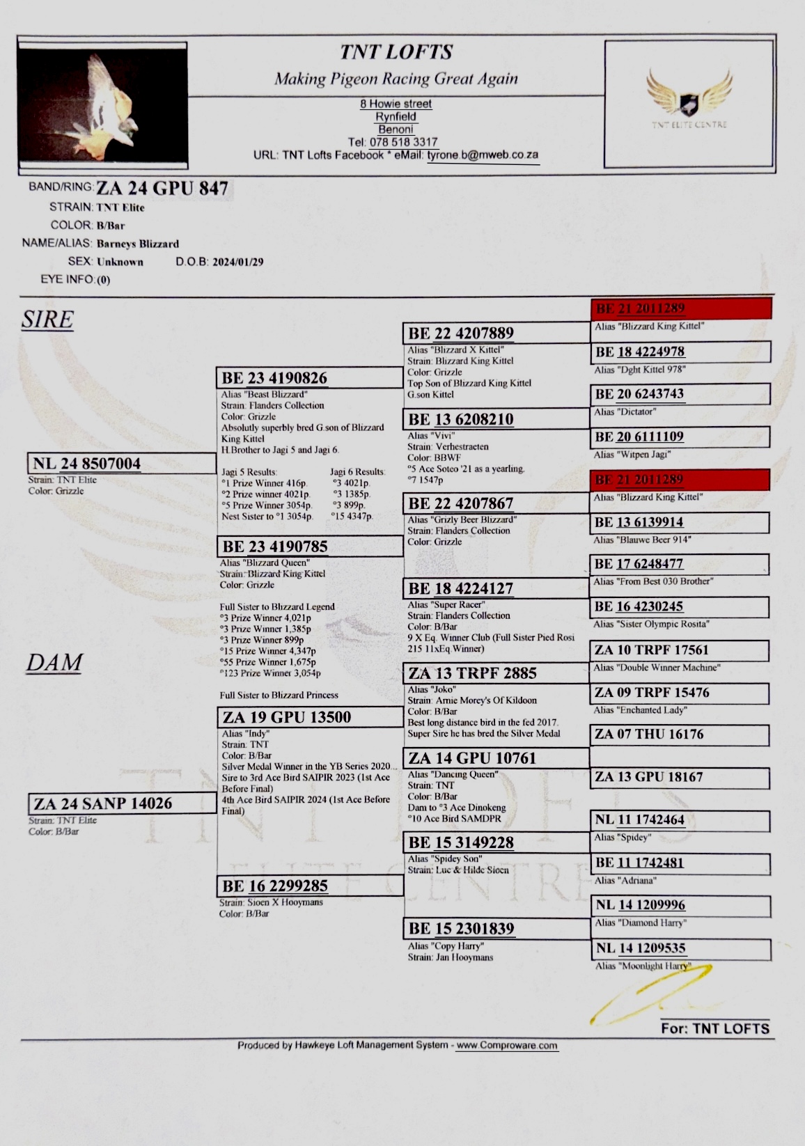 LOT 41 AfrikaPro Auction 2B – TNT Elite Centre – ZA-24-GPU-847 -3RD RACE 1 EQUAL WINNER———————SIRE:NL 24 8507004 Strain: TNT Elite Color: Grizzle.DAM IS BE 23 4190785 Alias “Blizzard Queen” Strain Blizzard King Kittel Color: Grizzle.———DAM:ZA 24 SANP 14026 Strain: TNT Elite Color: B/Bar. SHE IS A DIRECT DAUGHTER TO SUPER BREEDER “JOKO”.SEE PEDIGREE!!!