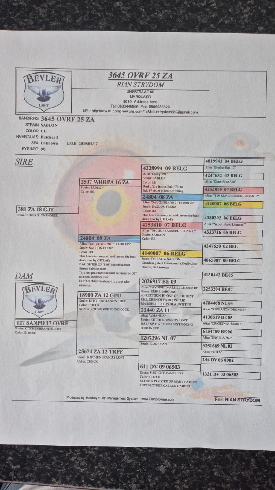LOT 42 SAIPR SUMMER AUCTION 3 – Cannistaro 2- OVRF 3645 2025*** -SIRE : ZA 18 GJT 381. 810 SABLON INBRED. THIS COCK IS BRED OF A MOTHER AND SON MATING. 24804 THE 810 HEN PRODUCED THE MOST WINNERS FOR GJT LOFTS AS A NON KAASBOER HEN. DAM : ZA 17 OVRF 127. KITCHENBRAND LOFTS. THE SIRE IS A GRANDSON OF “SUPERSON DEN DROMER”. THE DAM IS BRED OUT OF KOOPMAN CROSSED WITH SUDHOFF VAN BEERS. SEE PEDIGREE!!!!!!!