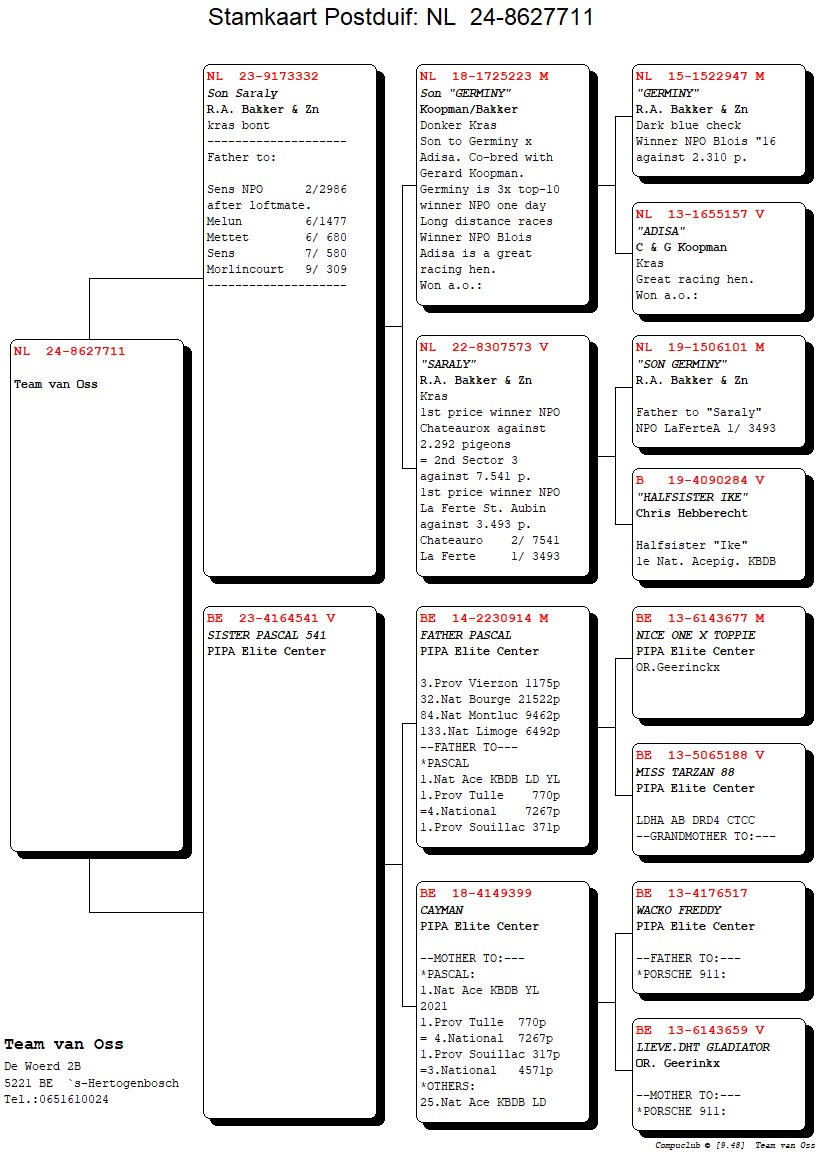 LOT 43 AFRIKAPRO AUCTION 1 – Team Van Oss-NL-24-8627711 -SIRE:NL 23-9173332 Son Saraly R.A. Bakker & Zn. FATHER TO Sens NPO 2/2986P AFTER LOFTMATE.———-DAM:BE 23-4164541 V SISTER PASCAL 541 PIPA Elite Center.SEE PEDIGREE!!!