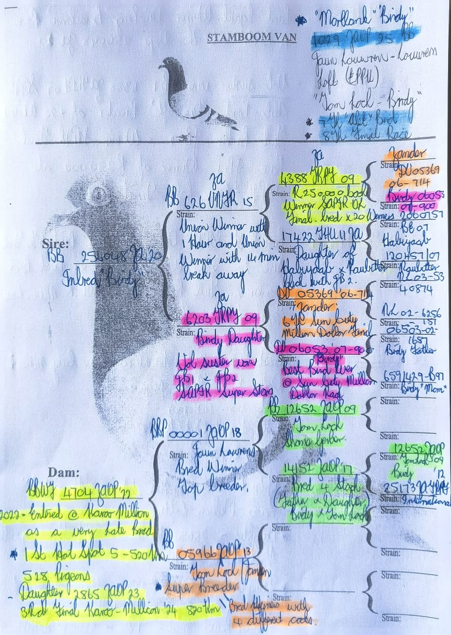 LOT 45 MARLBANK OLR – LOUWRENS LOFTS-ZA-25-OP-1029 -7TH ACE BIRD , 8TH FINAL——–SIRE:ZA 20 254048. INBRED BIRDY. DAM IS A DIRECT DAUGHTER TO “ZANDER” AND “BIRDY”.———DAM:ZA 22 OP 4704. DAUGHTER TO THIS HEN FLEW 3RD FINAL KAROO MILLION 2024.SEE PEDIGREE!!!
