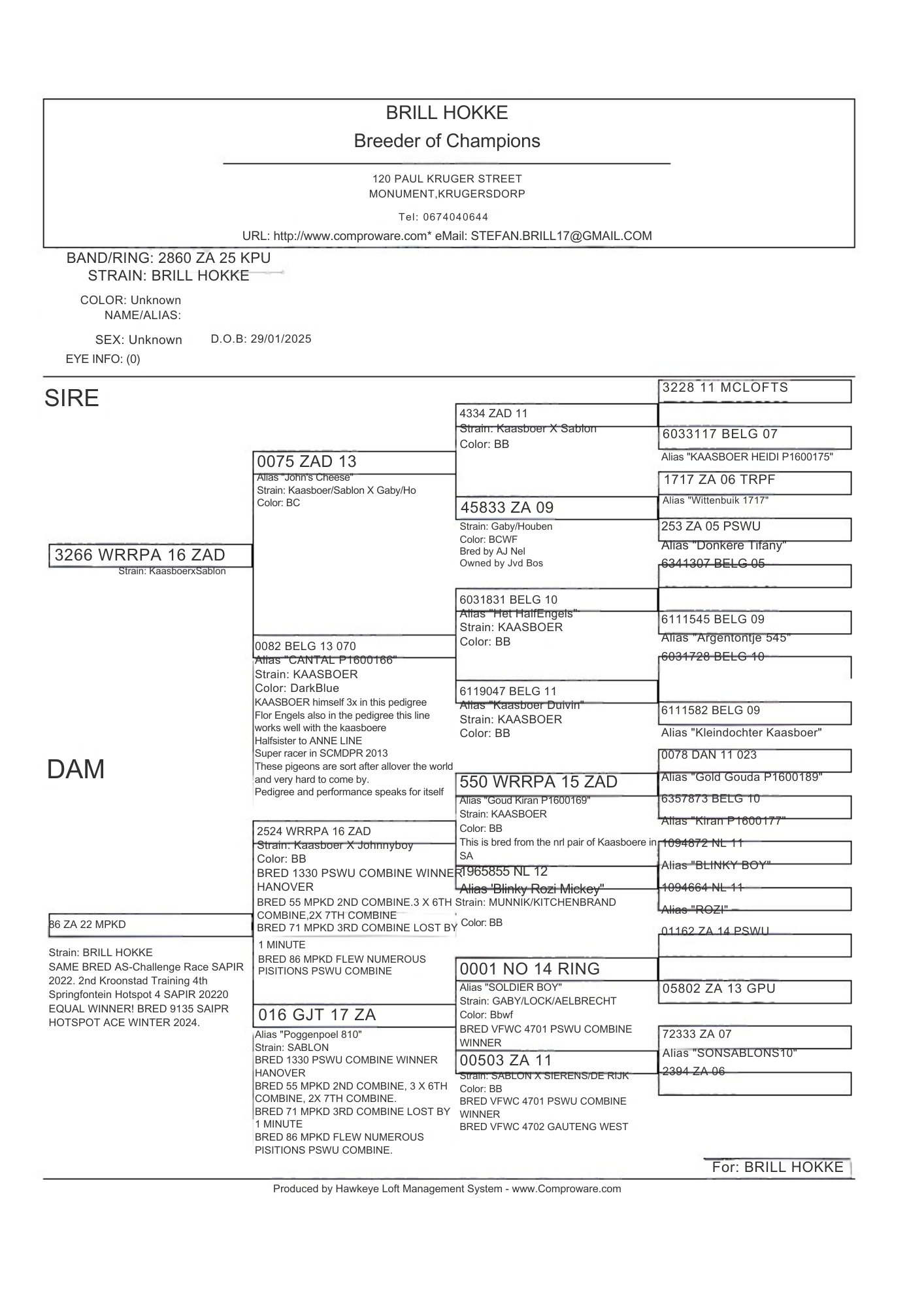 .LOT 5 SAIPR AUCTION 2 – Coenie Hattingh-ZA KPU 2865 2025 · ——BRED BY BRILL HOKKE—–SIRE:-ZA GPU 3079 ’23 -Bred from out best Sablon x Carelly X Tom Lock Genetics. Sire, WHITAKER, direct son to BOYTJIE x JBM’s GIRL. Full brother to ROCKY who bred PILOT EYE 4th ACE bird Dinokeng OLR 2020 & 8th Barzalona race 2020. ROCKY is grandfather to MISS NAVIGATOR, Bakkie Winner at Dinokeng OLR 2021. ROCKY is grandfather to STORM CHASER, 1st winner by 4 min Dinokeng OLR Final 2022 & grandfather to OCEAN BREEZE, equal winner 2nd by 4 min Dinokeng OLR Final 2022. Dam, CARELLY TOPS, bred back 4 times to GOLDEN CARELLY. CARELLY TOPS superbreeder for Jaco Faul.———–DAM:ZA 23 KPUD 285 . SUPER RACER FOR BRILL HOKKE. KAASBOER/JOHNNY BOY/TOM LOCK. SAME BRED AS- Challenge Race SAPIR 2022. 2nd Kroonstad Training. 4th Springfontein Hotspot 4 SAPIR 2022 – EQUAL WINNER! BRED 9135 SAIPR HOTSPOT ACE WINTER 2024..SEE PEDIGREE!!!