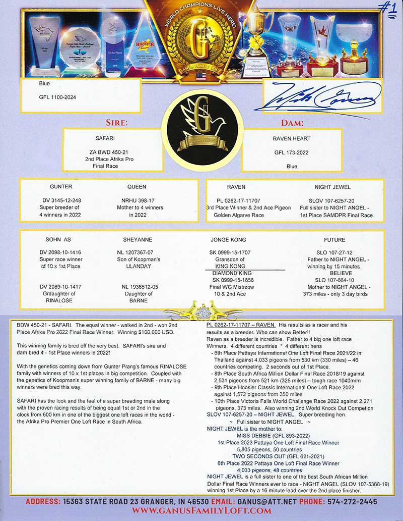 LOT 46 AfrikaPro Auction 2B – Ganus Family Loft 2 – AU-24-GFL-1100 -SIRE:BDW 450-21 – SAFARI. The equal winner – walked in 2nd – won 2nd Place Afrika Pro 2022 Final Race Winner. Winning $100,000 USD.This winning family is bred off the very best. SAFARI’s sire and dam bred 4- 1st Place winners in 2022!———–DAM:GFL 173-2022. SIRE IS PL 0262-17-11707 – RAVEN. His results as a racer and his results as a breeder. Who can show Better!! Raven as a breeder is incredible. Father to 4 big one loft race Winners. 4 diferent countries 4 different hens – 6th Place Pattaya International One Loft Final Race 2021/22 in Thailand against 4,033 pigeons from 530 km (330 miles) – 46 countries competing. 2 seconds out of 1st Place.SEE PEDIGREE!!!!