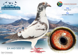 LOT 24 CAPETOWN LOFTS – J & T Engelbrecht Team 1-ZA-JT ENGELBRECHT-25-92*** -3RD HOTSPOT 1 —–HIS/HER BROTHER WON FINAL RACE 2025 OVER 601 KM AT CTIOLR, WINTER—–SIRE:52 JT ENGELBRECHT 24. “JOKER BEST KITTEL 24”. Engelbrecht: Forbes/Best Kittel/Shakira Mating Brother to Sister, both who already proved their value to breed EXCELLENT RACERS, LIKE WINNER 304 km DINOKENG, WHO BRED 4 TH ENDURO ACE AFRIKAPRO ’24, + HIS MOM BRED 31 ST ACE PIGEON AFRIKAPRO ’23..—————–DAM:41 JT ENGELBRECHT 24 BBAR Engelbrecht:Zander/Birdy/Rau britter/foot As Youngster of 2024, she achieved 7 th prize in Hotspot 2 over 220 km against 1301 Pigeons. Her father is a proven breeder for lower velocities. Her mother bred winners and close to winners on local and in OLR. She is a star breeder.SEE PEDIGREE!!!!