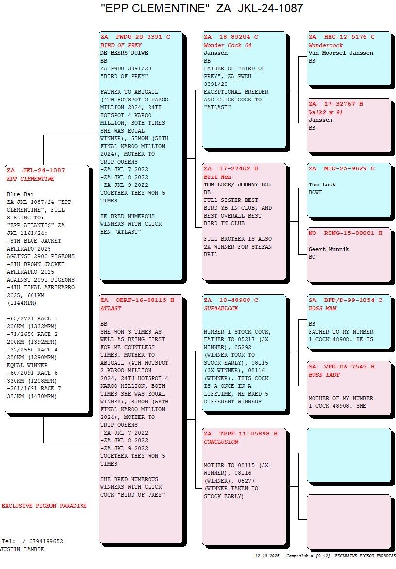 LOT 46 DINOKENG OLR AUCTION 2 – EXCLUSIVE PIGEON PARADISE-ZA JKL 24- 1087 -FULL SIBLING TO: “EPP ATLANTIS” ZA JKL 1161/24: -8TH BLUE JACKET AFRIKAPO 2025 AGAINST 2900 PIGEONS -8TH BROWN JACKET AFRIKAPRO 2025 AGAINST 2091 PIGEONS -4TH FINAL AFRIKAPRO 2025————SIRE:ZA PWDU-20-3391 C BIRD OF PREY DE BEERS DUIWE.FATHER TO ABIGAIL (4TH HOTSPOT 2 KAROO MILLION 2024, 24TH HOTSPOT 4 KAROO MILLION, BOTH TIMES SHE WAS EQUAL WINNER), SIMON (58TH FINAL KAROO MILLION 2024), MOTHER TO TRIP QUEENS -ZA JKL 7 2022 -ZA JKL 8 2022 -ZA JKL 9 2022 TOGETHER THEY WON 5 TIMES.————DAM:ZA OERF-16-08115 H.SHE WON 3 TIMES AS WELL AS BEING FIRST FOR ME COUNTLESS TIMES. MOTHER TO ABIGAIL (4TH HOTSPOT 2 KAROO MILLION 2024, 24TH HOTSPOT 4 KAROO MILLION, BOTH TIMES SHE WAS EQUAL WINNER), SIMON (58TH FINAL KAROO MILLION 2024), MOTHER TO TRIP QUEENS -ZA JKL 7 2022.SEE PEDIGREE!!!