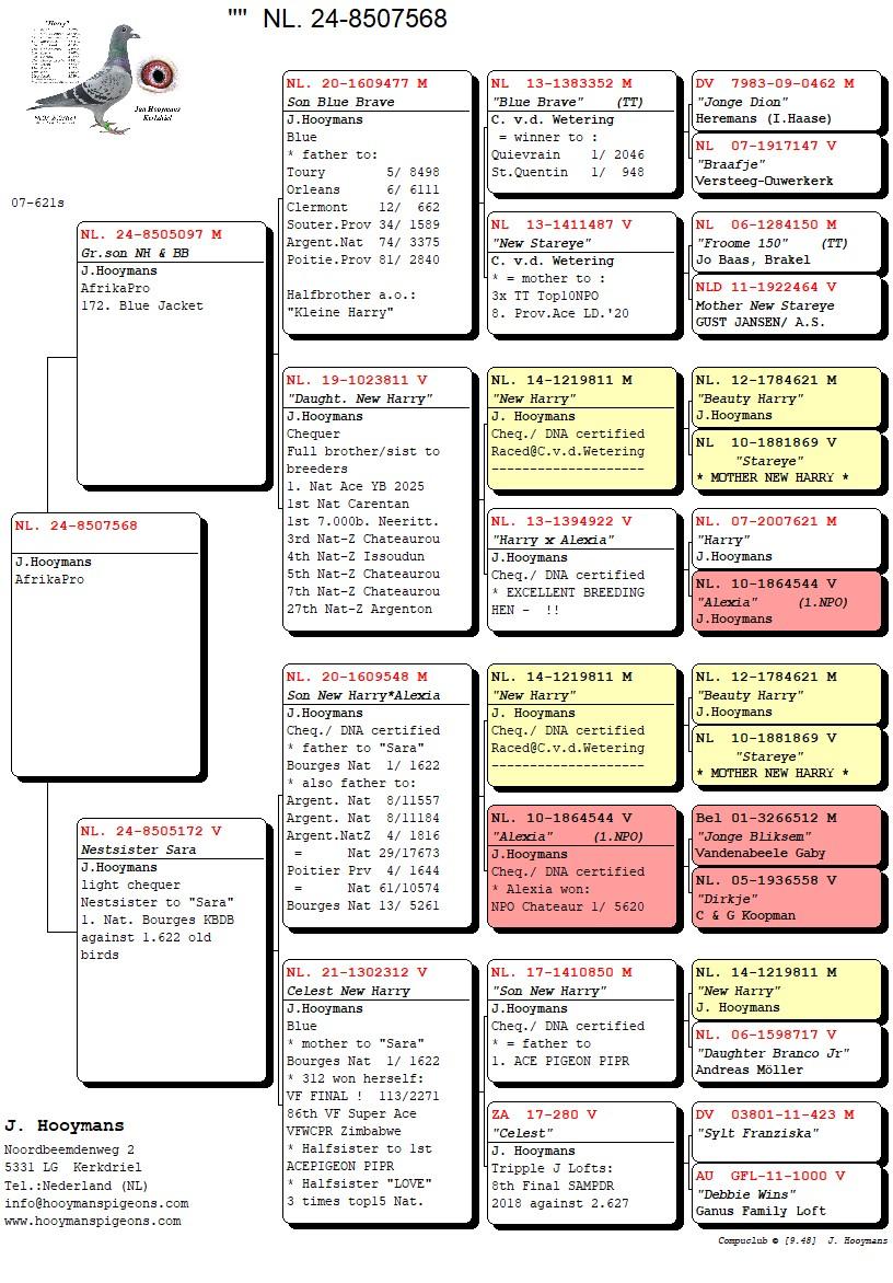 .LOT 5 AFRIKAPRO AUCTION 3 – Jan Hooymans I-NL-24-8507568 -SIRE:NL. 24-8505097 M Gr.son NH & BB J.Hooymans.BRED FROM DAUGHTER “NEW HARRY”.————-DAM:NL. 24-8505172 V Nestsister Sara J. Hooymans light chequer Nestsister to “Sara” 1. Nat. Bourges KBDB against 1.622 old birds.SEE PEDIGREE!!!