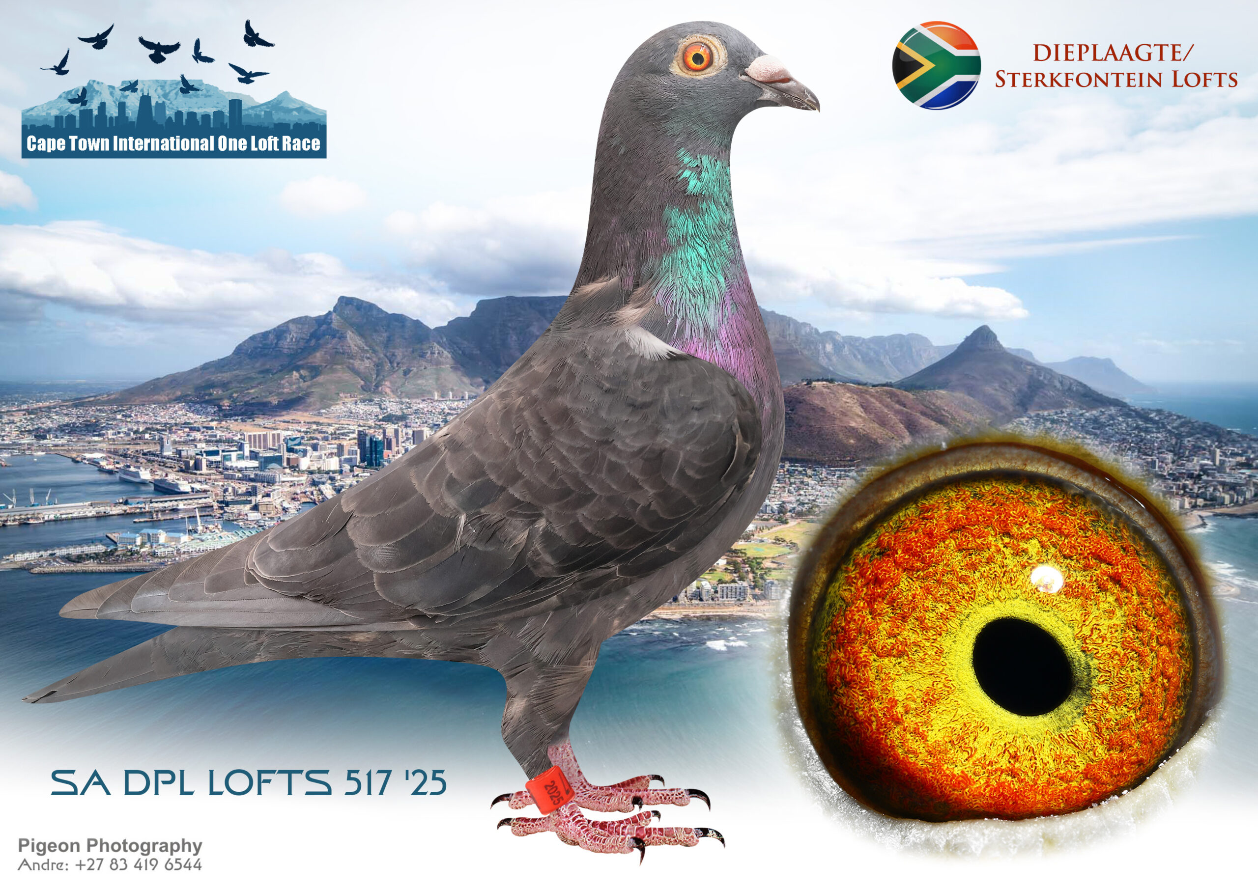 .LOT 5 CAPETOWN LOFTS AUCTION 3 – DIEPLAAGTE LOFTS – ZA 25 DPL 517 -SIRE:ZA-2018-155490 “SOETDORING 90” Dieplaagte & Sterkfontein Lofts.Super son “Blue Gold” and “Black Gold” • 4e Hotspot 7 Diaz Lofts 440km 2019. • 36e Benzing Ave. 3700km com. Father to “Sterkfontein 21” • 7e Hotspot 5 Central Prov. Lofts 2021. • Equal 1e Final Central Prov. Lofts 2021. Super Genetics! Best of “Zander” “Birdy” “Bjarne” “Boeing” and Black Oswald’s, Soetdoring Gold. ================DAM:ZA-2021-DPL-15 Dieplaagte & Sterkfontein Lofts.Bred from “Mr.Africa” One of Our Superstars and Top Breeders! Half-sister to the mother of, • 1e Final Diaz Lofts 635km 2025. • 1e Baby Series Diaz Lofts 2025. • 1e Big 5 Diaz Lofts 2025. • 1e Team Comp Diaz Lofts 2025. • 23e Charity Race Diaz Lofts 2025.SEE PEDIGREE!!!!