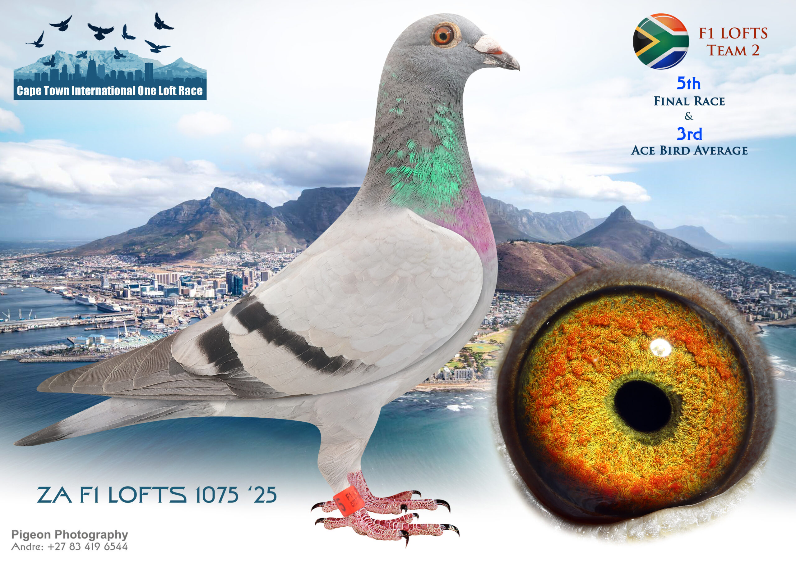 .LOT 5 CAPETOWN LOFTS – F1 Lofts Team 2-ZA-F1-LOFTS-25-1075*** -5TH FINAL RACE WINNING R20 000.00 , 3RD ACE BIRD WINNING R15 000.00 , 6TH HOTSPOT 4———–SIRE:ZA-2019-OOA-216 Dieplaagte & Sterkfontein Lofts Blue Full brother to: • 2e Combine PTA Leeu Gamka 996km. Half-brother to “Skywalker” the father of: ZA 25 OERF 2031 • 1e Bakkie Race Karoo Million 855km 2025. • 14e Ace Bird Overall Karoo Million 2025. Half-brother to “Dero’s Mix” the father of: • 4e Final Central Prov. Lofts 2024. Grandfather to “Eighty” (Leohan Bekker) • 12e Ace Cape Town Int. 2024. • 11e Final Cape Town Int. 2024. • 2e Hotspot 2 Cape Town Int. 2024. =====================DAM:ZA-2019-BDUD-1695 Du Plooy Family Lofts.The bloodline is responsible for countless winners in One Loft Racing, Her father’s full brother bred the grandfather to 5e Final Cape Town Int. 2025 for RMG Racing.SEE PEDIGREE!!!!