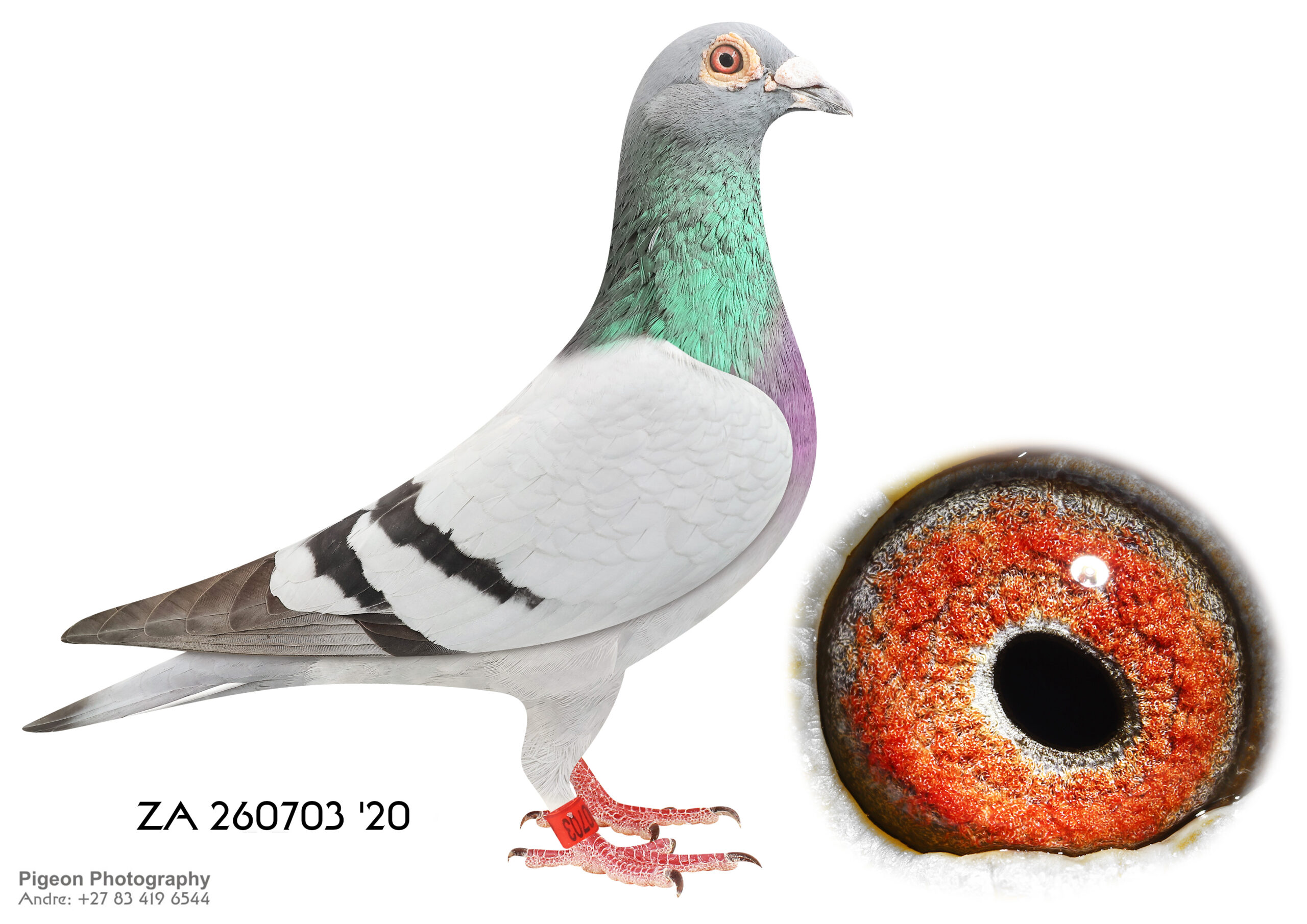 LOT 25 CORRIE NAUDE – ZA 20 TRPF 4858 -SIRE:29737 ZA 15.Sanpo Gold Medal Pair The father is Seabiscuit who was the SANPO Gold Medal winner. The best bird over all distances. Mated to Hetti. One of the best Million Dollar Race pigeons, bred out of Gabi Vandenabeele bloodline. The legendary Wittenbuik cock in Belgium.———DAM:3036 ZA GPU 18 Gold Medal BBPD Sanpo Gold & Silver Medal Pair Short Dis The Sire of this hen is a Spritzie Jansen Cock and 3 x winner. Best pigeon in the WRRPA and one of the SANPO Gold Medal Short Distance winners. The Dam of this hen is my SA National Pigeon Organisation Silver Medal Winner Short distance 2013.SEE PEDIGREE!!!!