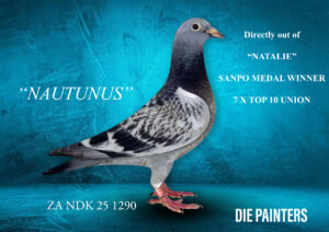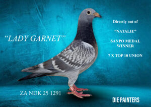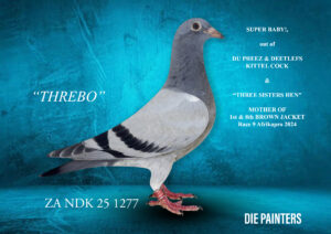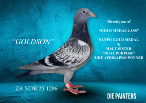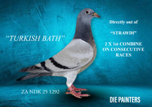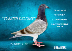 .LOT 5 DIE PAINTERS – ZA 25 KPUD 1361 “TURBOPOSE” – Ch If the new owner chooses to race this baby the chances are excellent that he will be a great racer. All the characteristics we look for in our babies destined for our team is present in this baby. Bred out of an inbred son of “THE FAMOUS SK HEN” when mated to her own son “SKAAM COCK” – this is a halfbrother of “DUAL PURPOSE” the father of the Afrikapro Winner. The mother is “TURBO SPEED” a double Union Winner and granddaughter of the famous “GOLDEN TT”. This hen has bred us some great racers and her one daughter won the LPU Union last year for Lionel Visser.SEE PEDIGREE!!!!