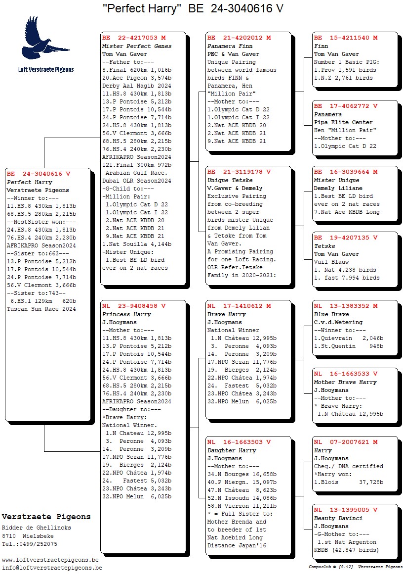 .LOT 5 LOFT VERSTRAETE – BE 24 3040616 -SIRE: “Mister Perfect Genes” – BE 22-4217053 Bred by Tom Van Gaver, this exceptional cock is a direct product of the world-famous “Million Pair” bloodline and represents one of the strongest genetic combinations in modern one-loft racing. “Mister Perfect Genes” is a direct son of “Finn”, a top racer and proven breeder with outstanding performances————-DAM: “Princess Harry” – NL 23-9408458 A top-bred hen from the renowned J. Hooymans loft, carrying the powerful Harry / Brave Harry bloodline, famous worldwide for producing national winners and elite long-distance pigeons. “Princess Harry” is a daughter of “Brave Harry”, a National Winner with exceptional performances.SEE PEDIGREE!!!!
