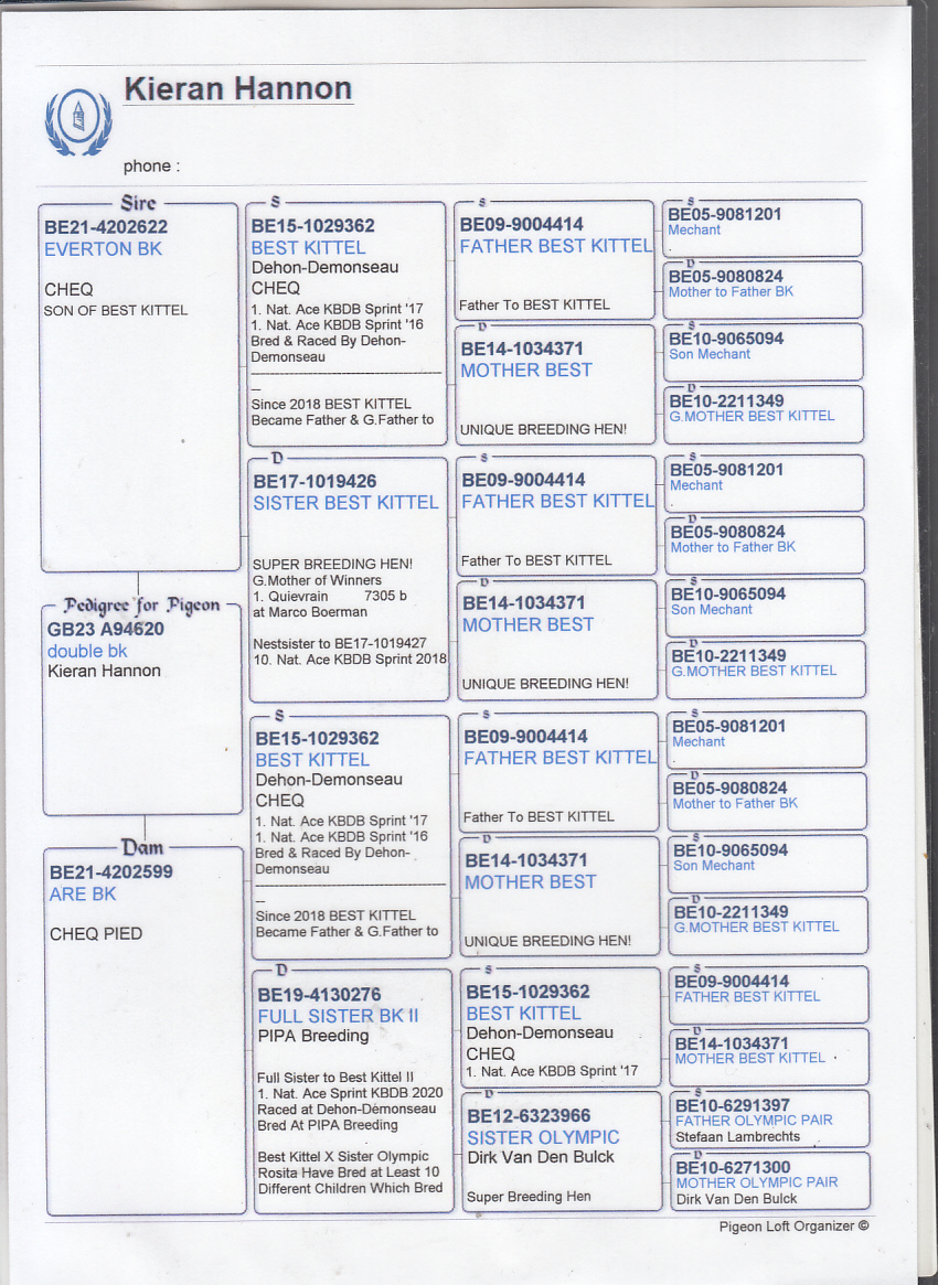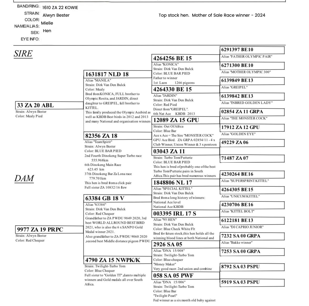 .LOT 5 MIKE ENGELBRECHT – ZA 25 ME BULLCAT 318 -SIRE:GB23 A94620 – Double Back (Kieran Hannon) A top-class, tightly bred pigeon built around one of the most dominant sprint families in the world – the legendary Best Kittel line. This pigeon represents pure class, combining proven performance genetics with elite breeding power on both sides of the pedigree. 🔥 Direct Son of EVERTON BK (BE21-4202622) A quality son of Best Kittel, carrying the explosive sprint genes that have dominated KBDB competition. Everton BK represents the continuation of a golden line known for speed, consistency, and winning mentality.—————DAM:1610 KOWIE 22. ALWYN BESTER KITTEL. GRANDFATHER IS THE SUPER 63384 KITTEL COCK OF ALWYN BESTER. SEE PEDIGREE!!!!