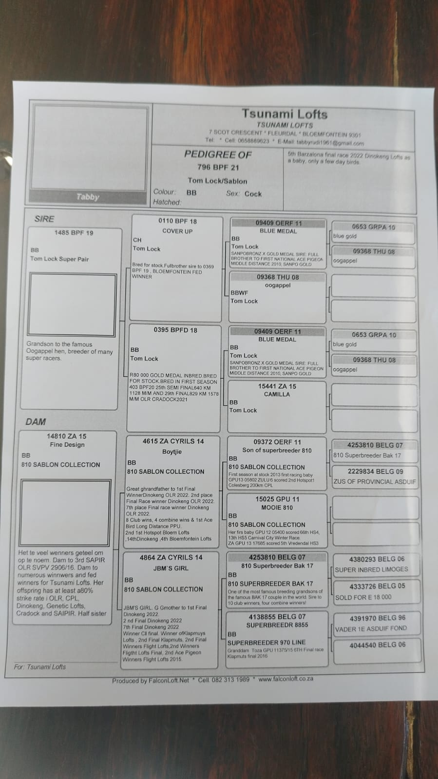 .LOT 5 TSUNAMI LOFTS -ZA 21 BPF 796 -SIRE:1485 ZA 19 BPF. TOM LOCK SUPER PAIR. THIS IS A DIRECT GRANDSON TO FAMOUS “OOGAPPEL HEN”.———–Dam: 14810 ZA 15 Colour: BB FINE DESIGN . 810 SABLON COLLECTION. DIRECT CHILD TO “BOYTJIE”(SOLD FOR R52 000.00) AND “JBM’S GIRL” (SOLD FOR R86 000.00) . INBRED AND LINEBRED TO SUPERBREEDER “810” & “970” BRED FOR STOCK DAM TO JBM`S “DAILY LOTTERY” 2017 ENTRY SAPIR INT. ONE DAY LOFT RACE FOR JBM HERTZOG 2ND (EQUAL WINNER WALKED IN SECOND) HOT SPOT 3 1/09/17 -1650.9394 M/MIN -370KM.SEE PEDIGREE!!!