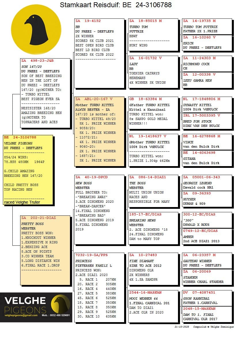 LOT 50 AfrikaPro Auction 2B – Velghe & Truter – BE-24-3106788 -SIRE:498-23-J&B.SON ABL 167/20. SON OF BEST BREEDING HEN IN THE LOFT OF DU PREEZ – DEETLEFS 167/20 (g) MOTHER TO: TURBO KITTEL BEST PIGEON EVER SA. NESTSISTER 168/20 AMAZING BREEDING HEN (g) MOTHER TO TOPRACERS AND ACES.———–DAM:ZA 202-21-DIAZ. WEBSTER LOFTS.“PRETTY BOSS” PRETTY BOSS WON: 1.KNOCKOUT WINNER, 1.EXPENSIVE M RING, 2.BENZING ACE, 8.ACE ON POINTS, 3.CO WINNER TEAM, 5.LONG DISTANCE WIN, 6. FINAL RACE 1ST DROP.SEE PEDIGREE!!!