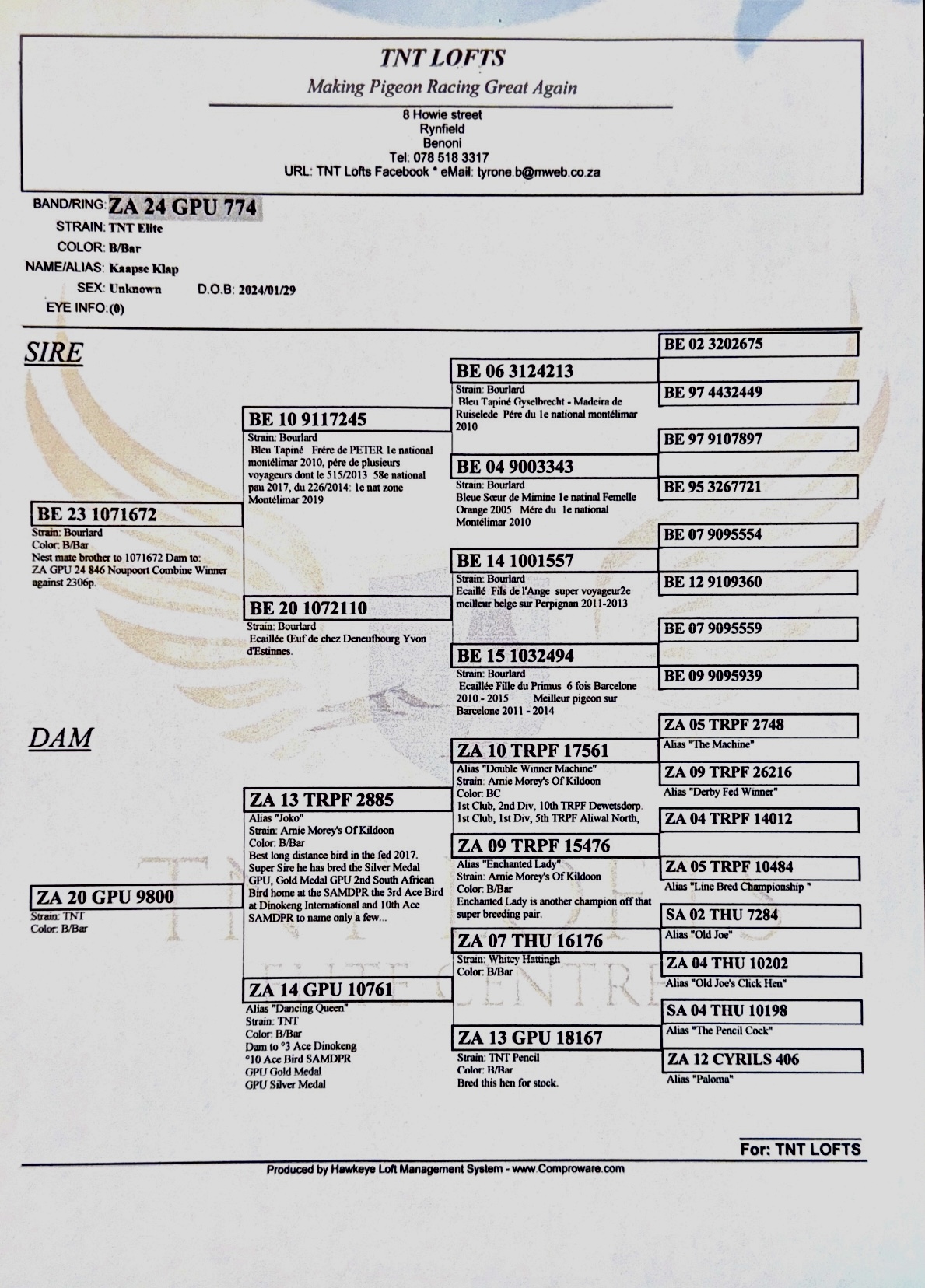 LOT 51 AFRIKAPRO AUCTION 1 – Doc Kev TNT-ZA-24-GPU-774 -SIRE:BE 23 1071672 Strain: Bourlard Color: B/Bar.Nest mate brother to 1071672 Dam to: ZA GPU 24 846 Noupoort Combine Winner against 2306p..————DAM:ZA 20 GPU 9800 Strain: TNT.SIRE IS “Joko” Strain: Arnie Morey’s Of Kildoon Color: B/Bar Best long distance bird in the fed 2017. Super Sire he has bred the Silver Medal GPU, Gold Medal GPU 2nd South African Bird home at the SAMDPR the 3rd Ace Bird at Dinokeng International and 10th Ace SAMDPR to name only a few..SEE PEDIGREE!!!