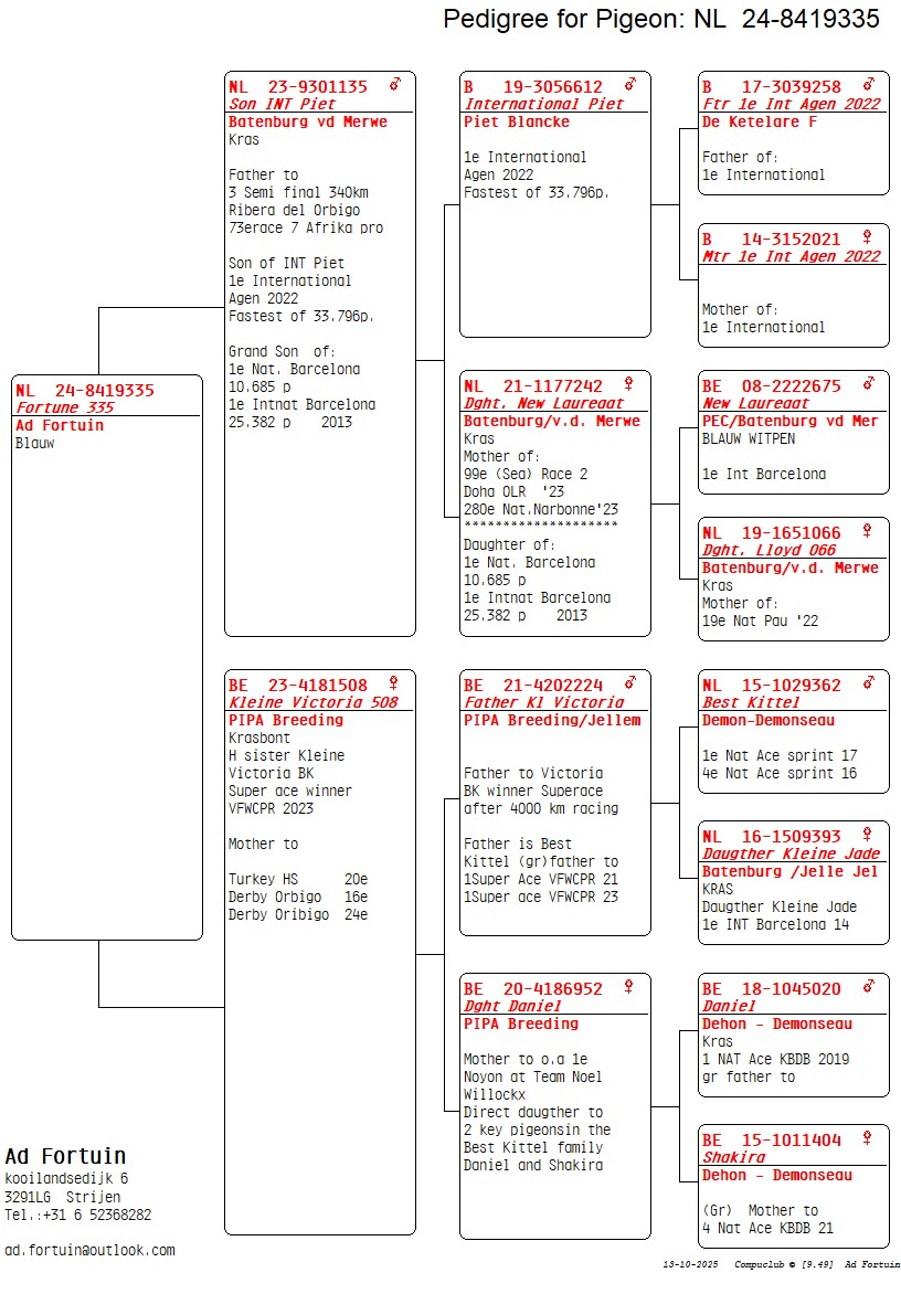 LOT 75 AFRIKAPRO AUCTION 3 – Jort Batenburg-BE-24-4174590 -SIRE:BE23-4181066 Méchant BK X Mother BK Father to 681-24, winner of 1. Pont St Max 636 pigeons.———-DAM:NL 19-1531803 Lady Milos II Or. Verweij-de Haan.N-Holland Narbonne 6.725 p. 43. North Holland Agen 1.210 p. 5.480 p. 443 National Agen 164. INational Narbonne 8.330 p. 12. I. National Ace Narbonne.SEE PEDIGREE!!!