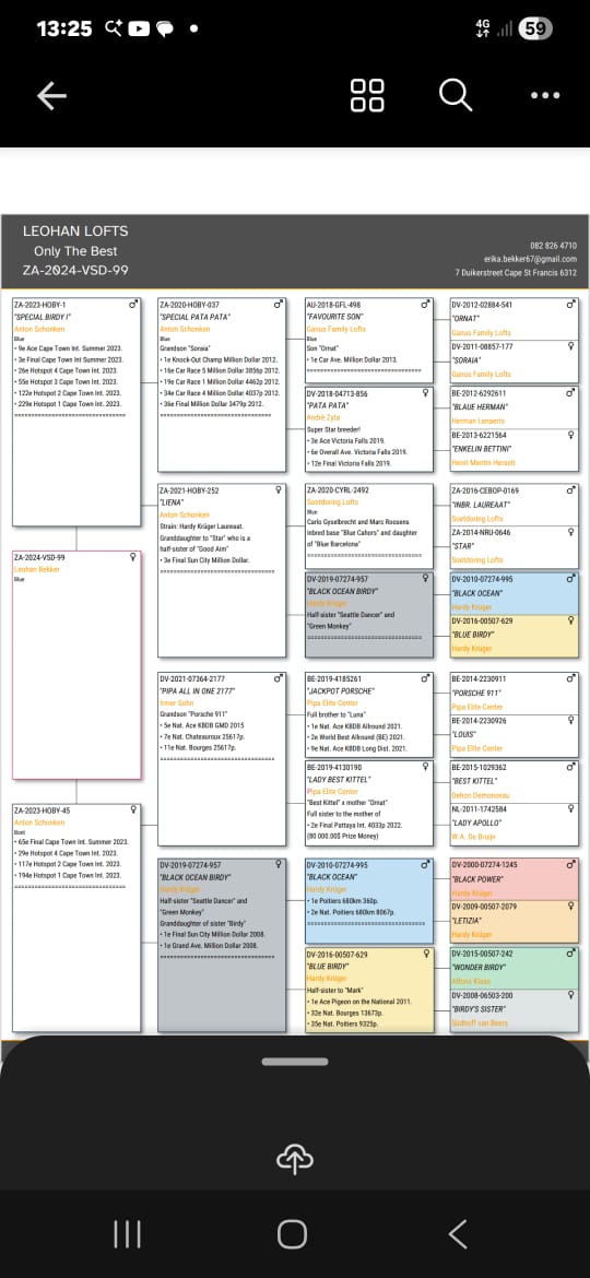 LOT 11 CARNIVAL ALL FLIGHT GOLD CUP AUCTION 2 –Leohan Hokke-LEO 25 30 -SIRE:ZA 23 OP 11991.SIRE IS AU 2017 AFL 223.ALIAS: ALMA FULL BROTHER OF: 18TH PLACE CAR RACE #1 – 3532 19TH PLACE CAR RACE #2 – 3511 8TH PLACE HOTSPOT #4 – 1547 HALF BROTHER OF: 1ST PLACE SFTC 260 MILE 9TH PLACE BIG ANDY 9321B 7TH PLACE BIG ANDY 400 MILE 1ST PLACE BIG ANDY 150 MILE.———-DAM:ZA 24 VSD 99. BRED OUT OF 2 DIRECT BIRDS FROM ANTON SCHONKEN. SIRE IS GRAND CHRILD TO “BLACK OCEAN BIRDY”. DAM IS DIRECT CHILD TO “BLACK OCEAN BIRDY”.SEE PEDIGREE!!!