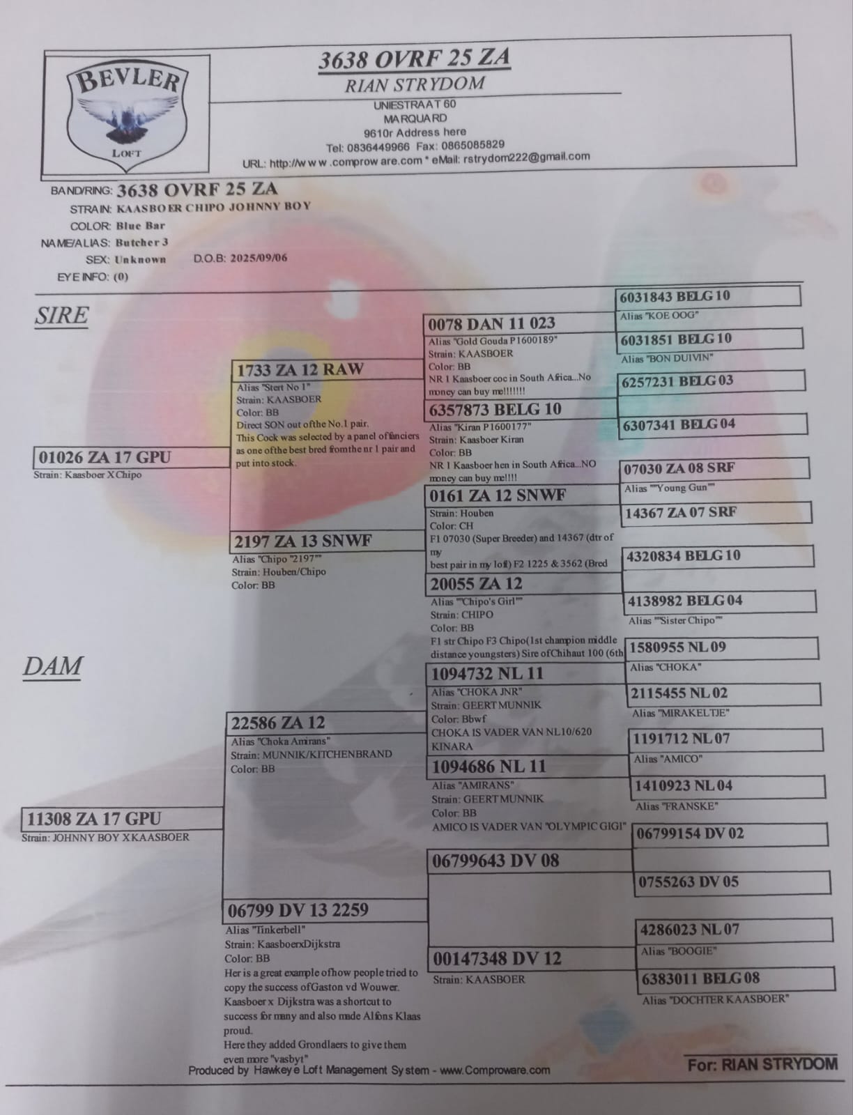 LOT 20 SAIPR SUMMER AUCTION 3 – Laurika & Ilze-OOA 325 2025 -SIRE:ZA 16 CYRILS 2895 Alias “SON SANPO GOLD” Strain: OUT OF AFRICA ACES Color: Cheque Pied KEEP IN STOCK.ZA CYRILS 2895/16 – Sire to Winner- 1st Club, 3rd GPU, Reddersburg, 414km, vel 1554 Raced by NINJA LOFTS 2- Bred by OOA Lofts. Sire to ZA VPU 9470/22-Equal 1st On the drop 9th CPL Bloem Final, Prince Albert Road, 596km, vel, 1218 Bred by OOA Lofts, entered by P Emslee. Blockstock Lofts Ggsire to ZA VPU 9608/22- 10th Despatch Eastern Cape One Loft Final 607km, vel 1158——————————-DAM:ZA 25 WPU 1841 Alias “SUPER DOUBLE 264″ Strain: SUPERSPRINT 264 KITTEL LI Color: MEALY PIED ZA WPU 1841/25-” SUPER DOUBLE 264′- Her dam’s 1st racer baby bred, NL 9113271/23 Dam to ZA OOA 345/25 – SAIPR SUMMER LOFT ENTRANT 2026 – 7th Final, 19th Ace Grand Averages ,Edenburg, 444km, vel 1144 Linebred to BELG 4230264/16 “SUPERSPRINT 264” Sire to NL 1848806/17 Sire to SUPERBREEDER COCKS OF ALWYN BESTER 63384 AND 63390- Sire and grandsire to SUPERSPRING KITTEL 264 – Double Great.SEE PEDIGREE!!!!
