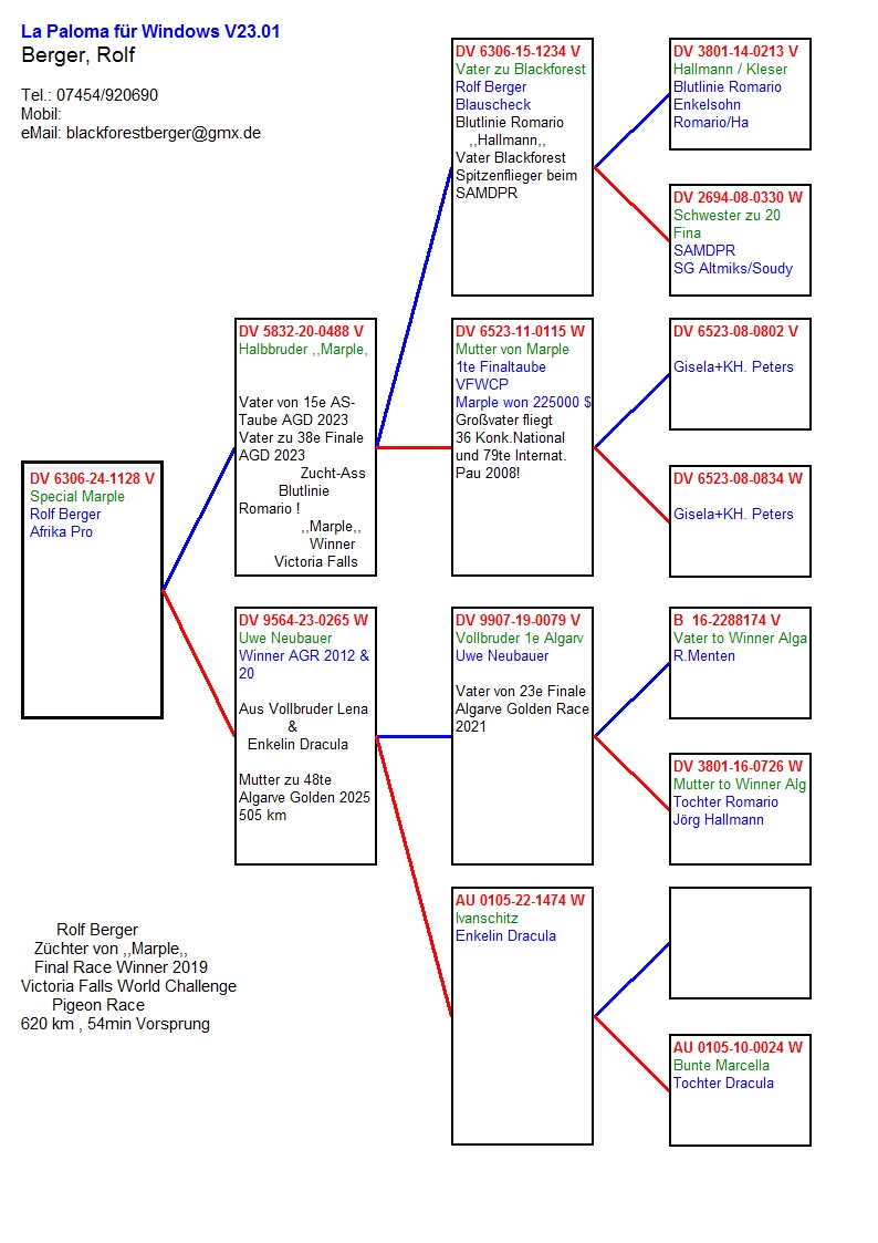 LOT 65 AFRIKAPRO AUCTION 6- Loft Verstraete – Brantegem 2 single-BE-24-3099702 -SIRE:23-9408400 “Just Like Wout”.J. Hooymans –Father to:— 1.Club 1,397 birds 1.Club 1,293 birds. Clermont 2024 3.HS.2 103km 1,155b Marismas Masters’25 5.Verb 3,470 birds Clermont 2024 13. Prov 11, 703 birds Pontoise 2024 15.Verb 3,254 birds 22.Verb 3,470 birds Clermont 2024————DAM:BE 23-3049907 “Perfect Nat Finn” Loft Verstraete –Mother to:— 4.Tr.10 75km 2,612b 12.HS.5 280km 2,215b 26. Final Dubai 908b 80 HS.1 148km 2,493b AFRIKAPRO Season2024 –G.Child to:— *Million Pair. 1.Olympic Cat D 22 1.Olympic Cat I 22 2. Nat ACE KBDB 20 2.Nat ACE KBDB 21 9. Nat ACE KBDB 21 1. Nat Souill 4,144b -Mister Unique: 1.Best BE LM bird ever on 2 nat races.SEE PEDIGREE!!!