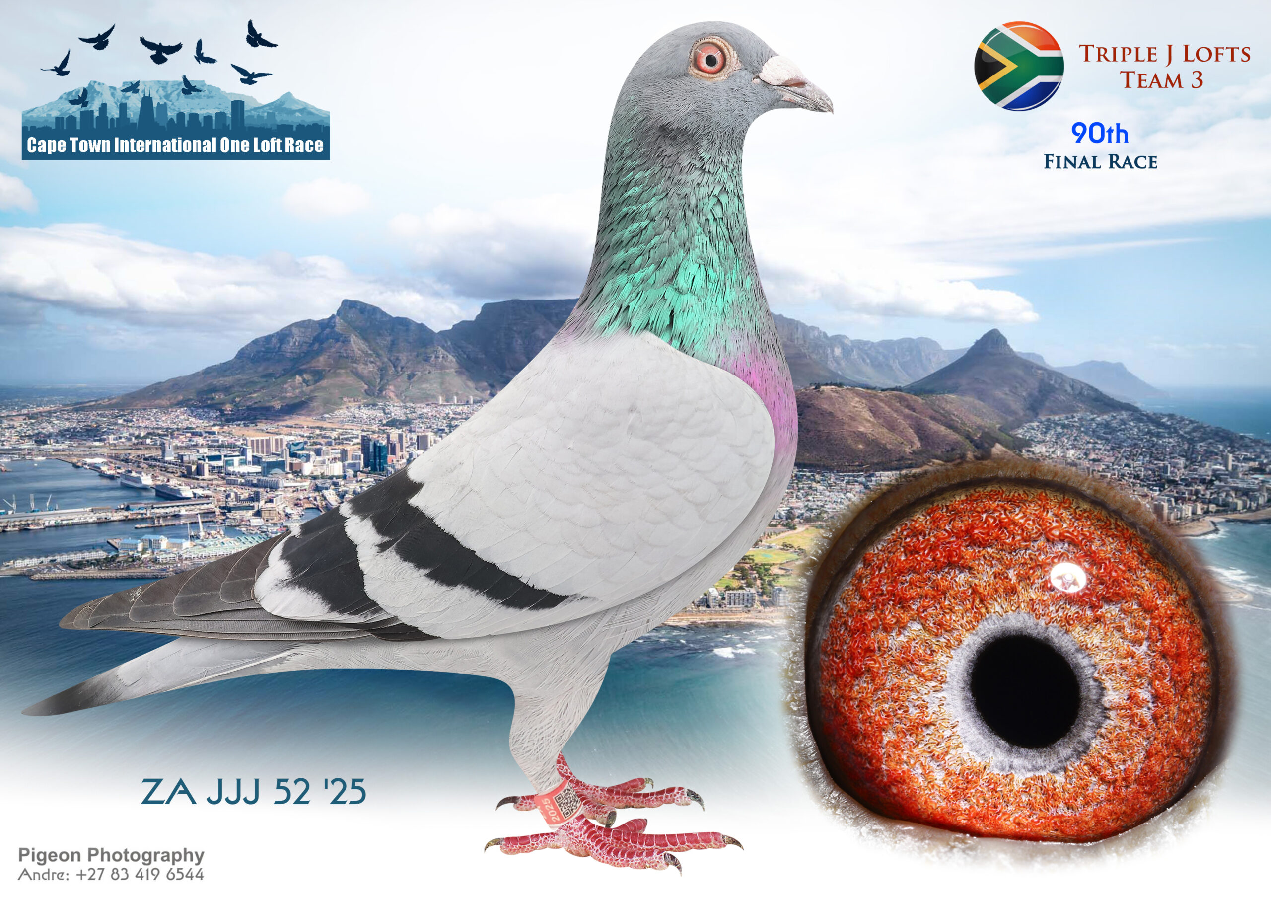 LOT 96 CAPETOWN LOFTS – Triple J Lofts Team 3-ZA-JJJ-25-340*** —21st HS1, 6th HS2, 3rd HS3, 15th HS4 !!!! 2nd Ace Bird prior to Final !!!—-Sire: ‘TOMMY’ ZA 2023 JJJ 107 Notes: TOMMY (completed 2024 Carnival Gold Cup) in his first breeding year bred two super racers in the 2025 Cape Town Summer Series – JEER & JUSTIFY – 1st & 2nd ‘Hot Spot’ Ace Pigeons after Hot Spot 4!!! ~ JEER (ZA 25 JJJ 69) –1st 2026 Cape Town Int Pigeon Race Hot Spot Ace – 9th HS 1 (175km), 24th HS 2 (225km), 15th HS 3 (275km) & 36th HS 4 (325km) ~ JUSTIFY (ZA 25 JJJ 340) – 2nd 2026 Cape Town Int Pigeon Race Hot Spot Ace 21st HS 1 (175km), 6th HS 2 (225km), 3rd HS 3 (275km) & 15th HS 4 (325km)————Dam: ‘BELLE’ ZA 2021 JJJ 307 Performance: BELLE was a SUPER racer at the 2022 Allflight Gold Cup Summer Series, winning: 4th Gold Cup Final! 2nd Ace Bird!! 5th Hot Spot 1!! 4th Hot Spot 2!! Belle was also mother of Jordy (13th 2022 Cape Town Summer Final)!SEE PEDIGREE!!!!