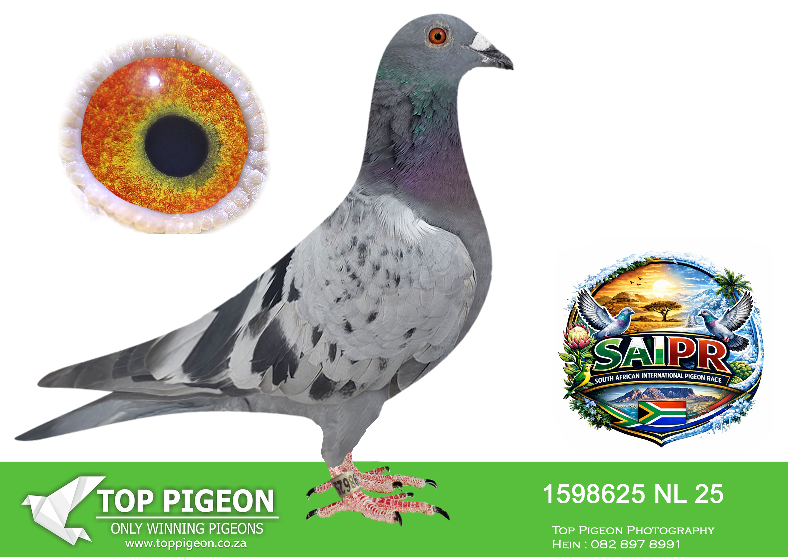 LOT 24 SAIPR SUMMER AUCTION 1 – Theuns Victor- VICTOR 107 2025 -9th Final Race WINNING R30 000.00——–SIRE:483 ZA 19 OOA .Alias “MR WOW” Strain: Tom Lock/Sablon Color: Blue Bar SUPER RACER 8 WEEKS IN A ROW FOR OOA LOFTS!! 7th Club, 18th VPU, Glen, Y/B, 286km, 1369mpm – 1993 pigeons 11th Club, 47th VPU, Tom’s Place, Y/B, 323km, 1416mpm – 2113 pigeons 49th Club, 152nd VPU, Springfontein, Y/B, 424km, 1014mpm————DAM:6493 ZA 21 KUR.Strain: Sablon/Tom Lock Color: Blue Bar.SEE PEDIGREE!!!!