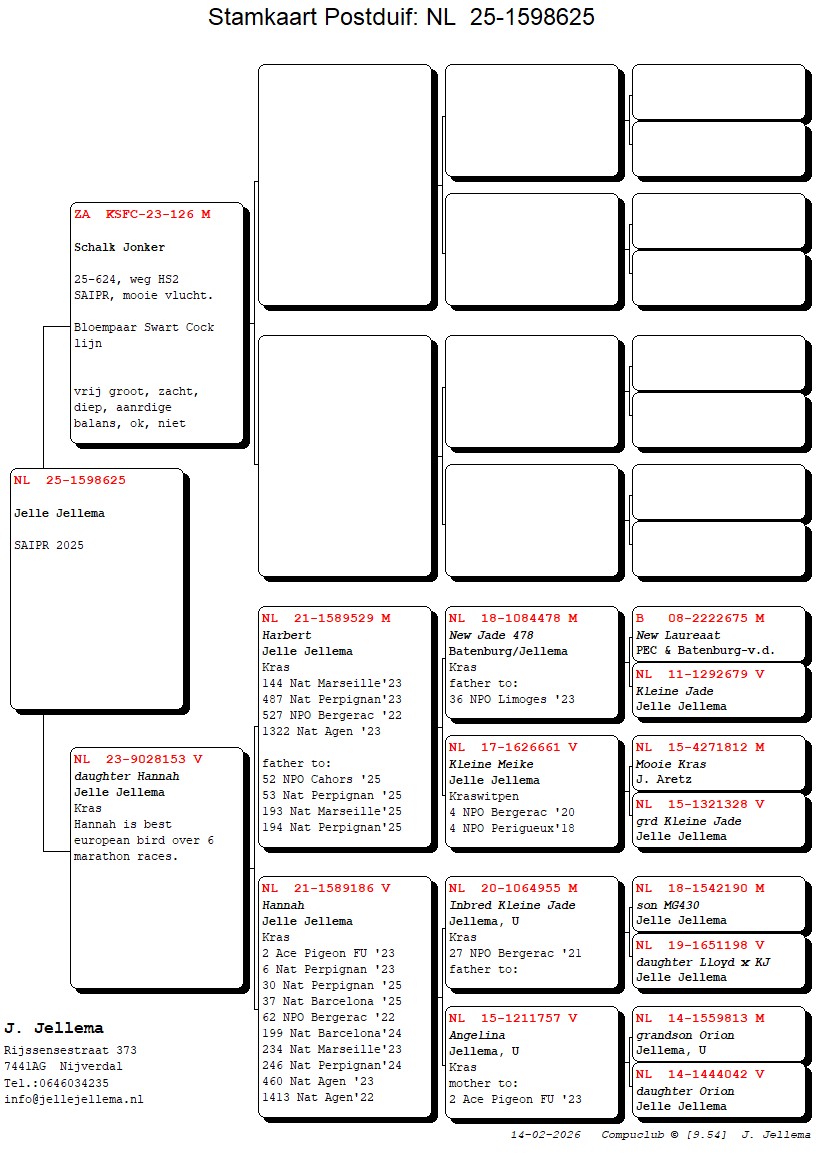 LOT 54 SAIPR SUMMER AUCTION 1 – Jelle Jellema 2- NL 1598625 2025 -SIRE:ZA KSFC-23-126 M. SCHALK JONKER.———DAM:23-9028153 V daughter Hannah Jelle Jellema Kras Hannah is best. european bird over 6 marathon races.SEE PEDIGREE!!!