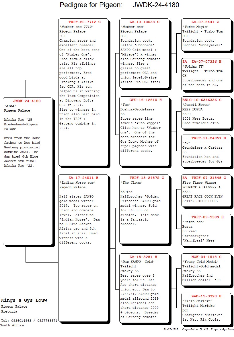LOT 56 AFRIKAPRO AUCTION 2 -Bredenhand – Pigeon Palace-ZA-24-JWDK-4180 -EQUAL WINNER RACE 4—-Bred from the same father to Ace bird Gauteng provincial combine 2024. The dam bred 6th Blue Jacket 9th final Afrika Pro ’22.——-SIRE:TRPF-20-7712 C ‘Number one 7712’ Pigeon Palace.Champion racer and excellent breeder. One of the best sons of ‘Number One’. Bred from a click pair. His siblings are all top performers. Bred good birds at Dinokeng & Afrika Pro OLR. His son helped us in winning the Team Competition at Dinokeng Lofts OLR in 2024. Sire to winners in union also Best bird in the TRPF & Gauteng combine in 2024.————-DAM:ZA-17-24011 H ‘Indian Horse sus’ Pigeon Palace.Half sister SANPO gold medal winner 2019. Top racer on Union and combine level. Sister to ‘Indian Horse’. Dam to 6 Blue Jacket Afrika pro and 9th final in 2022. Bred winners with 3 different cocks.SEE PEDIGREE!!!