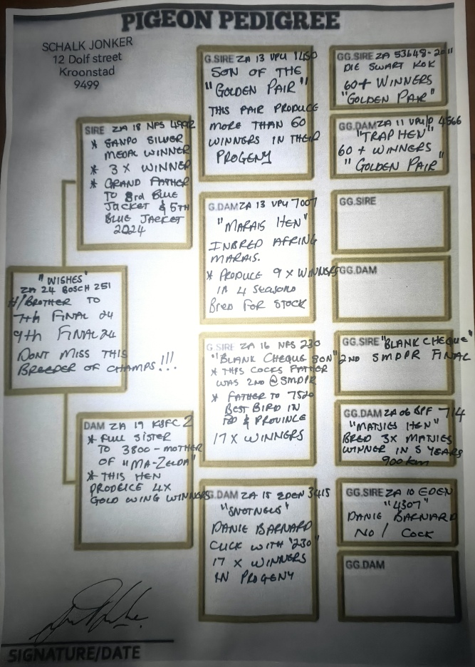 LOT 50 AFRIKAPRO AUCTION 3 – JP Cilliers & Beneke Lofts-ZA-24-SANPO-25928 -SIRE:1826 CYRL 23.HARDY KRUGER/VERSTRAETE. 14TH FINAL CARNIVAL LOFTS ORL 2024, 1ST TRAINING FLIGHT8 7TH TRAINING FLIGHT 18. H/SISTER 29 SAPIR FINAL 2024 FOR TNT LOFTS. HALF SISTER CARNINAL WINTER RACE WINNER AND ACE BIRD 2023.———–Dam: 2934 ZA TRPFD 16/ 6x Car-Bosua 34′ Her Sire 4126 Mega Inbr to Bartlo Oerlemans Double Car Win family via Dean Jooste & Ferdi Coetzer Connection goes back to the base of Johan Schmidt Blou Bul Royalty, Wouters, connected to Base Hen of Brandt Wepener Dght Golden Eggs Hen 2x Car Winners. Off which Chris Smith also gained 2x Car Wins/ Dam of 2934-16 is the Inbred Import Kees Bosua Super Stock Hen!SEE PEDIGREE!!!!!