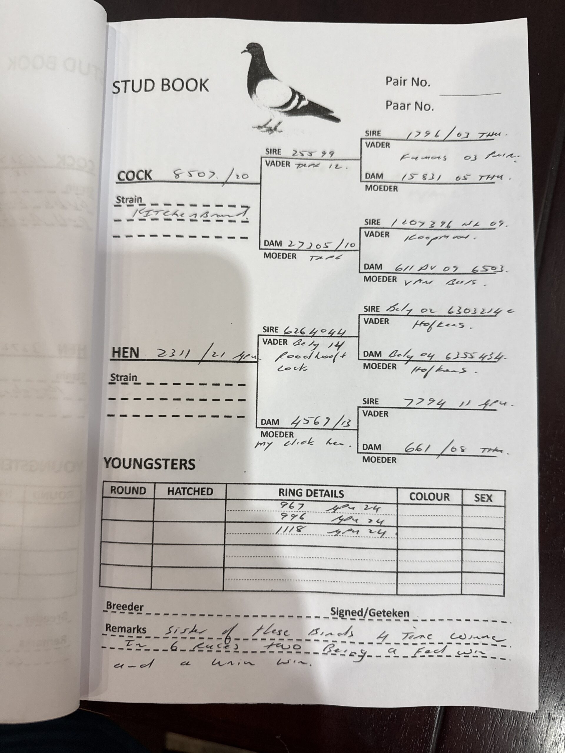 LOT 19 AfrikaPro Auction 2B – Team Van Oss – NL-24-8627728 -RACE 1 EQUAL WINNER , RACE 2 EQUAL WINNER , RACE 3 EQUAL WINNER———-SIRE:NL 22-8562721 M.Team van Oss blue.SIRE IS NL. 16-1663927 M Son Roney J.Hooymans.————DAM:NL 23-9173244 V.R.A. Bakker & Zn. DAM IS 21-1032912 V “GERMINY’S DREAM” R.A. Bakker & Zn Kras 2nd price winner NPO La Ferte St Aubin against 4435 p. Winner PIPA ranking combined Middle- en OLD races & 9th price winner PIPA ranking 2022 OLD.SEE PEDIGREE!!!