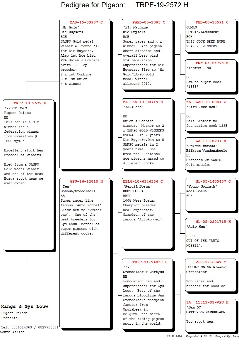 .LOT 6 EXCLUSIVE AUCTION – ZA 19 TRPF 2572 – This hen is a 3 x winner and a federation winner from Jamestown 1000 mpm—————-SIRE:ZA 15 03987 .Alias “MR.GOLD” Strain: DIE HUYSERS Color: BLUE CHECK “MR GOLD” DNA 19/174 1ST ACE NAT. SANPO GOLD MEDAL WINNER OVERALL 2017 1ST ACE BIRD PTA- COMBINE OVERALL 1ST ACE BIRD PTA-COMBINE OPEN SERIES 1ST ACE BIRD PTA-UNION SHORT.————DAM:ZA 16 GPU 12810 .Alias “Ten” Super Racer Line, “Auto Koppel” BOSUA x GRONDELAERS. One of the BEST breeders for Gys Louw. Click HEN to “Number One” Also bred super pigeons with 1125. SEE PEDIGREE!!!