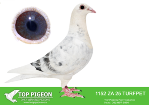 .LOT 3 HANNES TALJAARD – ZA 25 TURFPET 1152 -SIRE:ZA 24 VPU 7201 – Elite White Grizzle Cock A striking White Grizzle cock bred from top-class Whiteman genetics, ZA 24 VPU 7201 represents a powerful blend of proven performance and elite breeding lines. Bred from the renowned “Super White Grizzle” family, this cock carries the blood of some of the finest pigeons in the Whiteman strain, known for their consistency, durability, and class in both racing and breeding. 🔹 Sire Line: Direct from a top-performing lineage including BELG 6292350 (Late Mieljauw) and the exceptional White Man / Super Kweker Duff family. This line is packed with Ace Pigeon winners and foundation breeders, consistently producing top results and high-quality offspring. 🔹 Dam Line: Equally impressive, descending from the “White Man” dynasty, a line responsible for multiple National Ace Pigeons and Olympiad-class birds. Strong in both racing performance and breeding excellence, this side adds depth, reliability, and proven genetic strength. ———–DAM:ZA 21 ABL 482 – Elite Dirk Van Den Bulck Genetics A top-class pigeon bred from proven, world-renowned Dirk Van Den Bulck bloodlines, combining some of the most influential sprint and middle-distance genetics in modern racing. 🔹 Sire Line Excellence Direct from the famous “DYNasty Kittel” family, a line responsible for multiple national winners and champions. This side is packed with performance genes, including influences of KITTEL, GREIPEL, and Olympic Rosita blood, known for explosive speed and consistency at the highest level. 🔹 Dam Line Powerhouse The dam is a daughter of “KATT”, closely related to the legendary “GOEDE RODE” and “OLYMPIC ROSITA” lines, forming a golden breeding foundation within the Bulck dynasty. This line has produced top national performers and elite breeders, including winners at KBDB level.SEE PEDIGREE!!!!