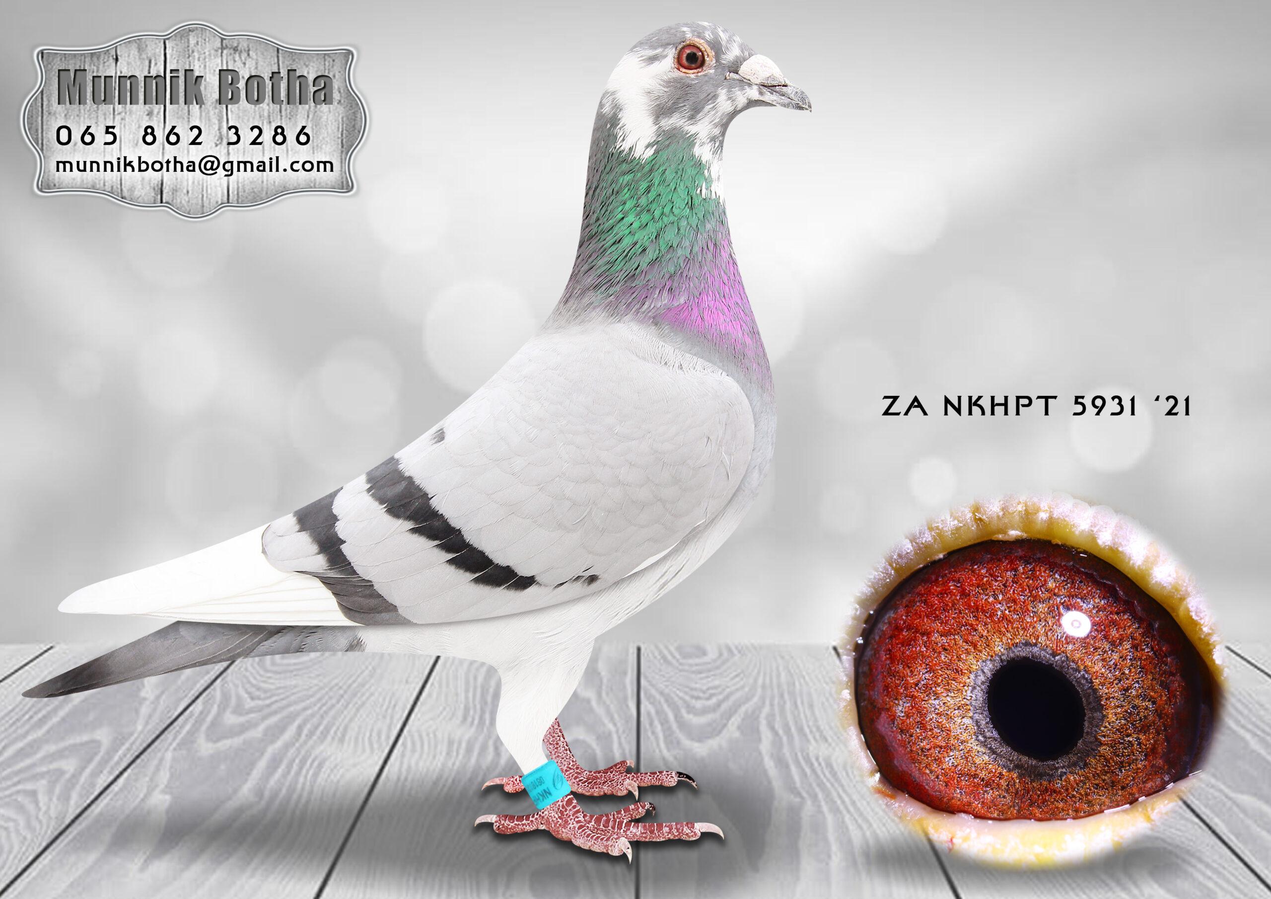 .LOT 6 MUNNIK BOTHA – ZA 21 NKHPT 5931 -SIRE: 00410 ZA 15 (Tom Lock line) A beautiful, well-balanced cock bred from the elite Tom Lock bloodline. He is a direct son of 08530 ZA TRPF 13 (DNA), a proven breeder responsible for multiple top performers, including winners and high achievers in competitive racing. This line traces back to the renowned “R80 000 Super Pair”, known for producing exceptional racing pigeons with both speed and endurance. The sire carries powerful genetic depth, combining class, structure, and proven breeding excellence. A pigeon built for performance, with a pedigree stacked with winners and top breeders.————DAM: 5590 ZA NKHP 20 (“810 Sablon Collection”) A quality hen bred from the famous 810 Sablon bloodline, one of the most successful and consistent families in modern pigeon racing. She originates from stock sourced through Top Pigeon, emphasizing elite selection and proven performance genetics. Her pedigree includes top-class lines such as “Green Eye 810” and “JJ’s Dream”, both linked to high-level race results and championship breeding success. She is bred specifically for stock, carrying strong foundation genetics with excellent breeding potential.SEE PEDIGREE!!!!