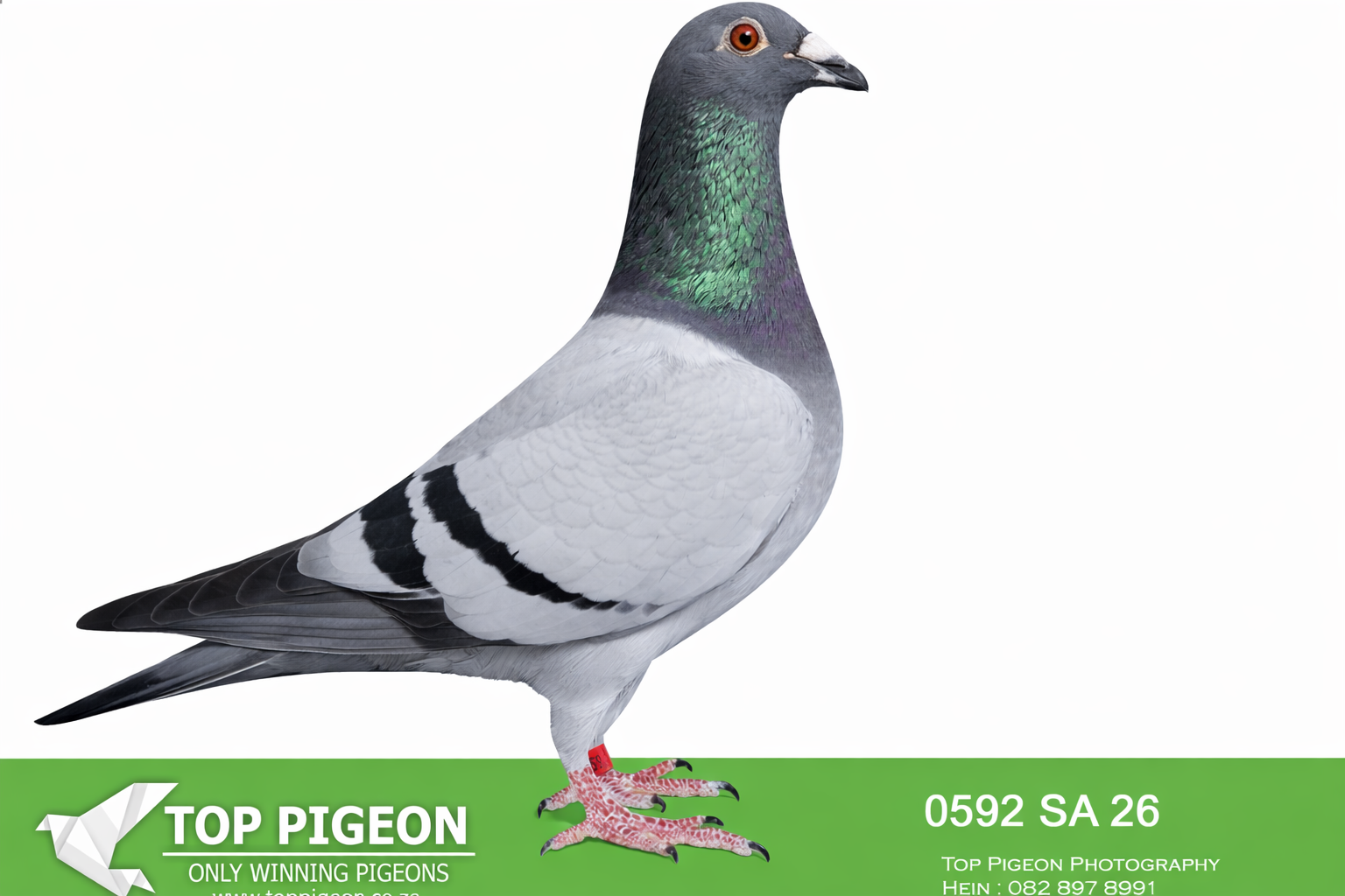 .LOT 6 PIGEON PALACE -SA 26 0592 -SIRE:JWDK-24-4002.’95/02′ Pigeon Palace Dark Check Bred from the most successfull Kittel pair in South Africa! Full brother to 63384/18&63390/18 Alwyn Bester Lofts. Responsible for amazing results over the last 3 years. ‘63384 g/f to Turbo Kittel SANPO Gold medal & 3rd world allround best bird. G/f to 9060/20 2nd Ace middle distance union. Sire to 604/22 1st Gauteng Combine Noupoort ’23 & double PTA union winner also ace pigeon overall. ‘63390’ sire to ‘Dynasty’ grand averages winner Dinokeng OLR ’22 also 343/21 union————————–DAM:ZAGJT-23-117 H ‘Chipo 117’ Kaasboer-Chipo. This pigeon was racing as a SAIPR tracker pigeon. Flew in front pack all the way. Up until hotspot 2 this pigeon were leading the hotspot averages. Best from Kaasboer x Chipo lines in this beautiful little hen.SEE PEDIGREE!!!